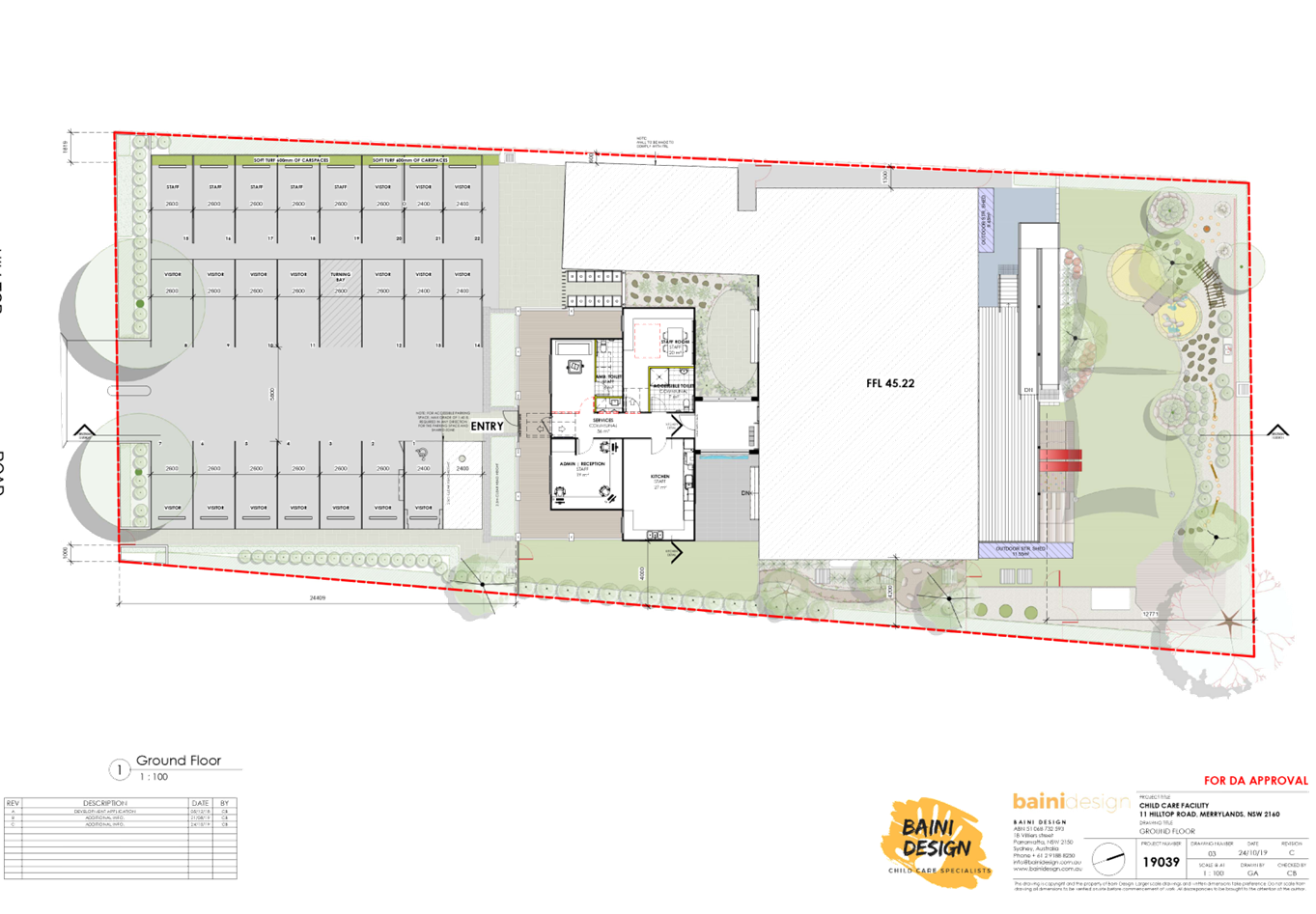 With a total of 53 children (30 x 3-5, 15 x 2-3, and 8 x 0-2), the centre will require 8 staff and 4 staff parking spaces. For 53 children, 14 visitor parking spaces would be required, giving a total of 18 parking spaces.