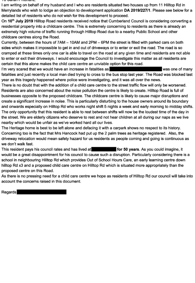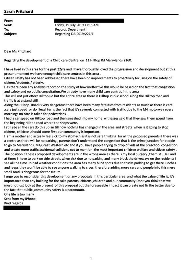 1. That DA 2019/227 be approved for alterations and fit out of an existing building to facilitate a 53 place centre based child care centre with 18 at grade parking spaces on land at 11 Hilltop Road Merrylands subject to the conditions provided in the draft determination. 2. That those persons who made a submission be notified of the determination. |