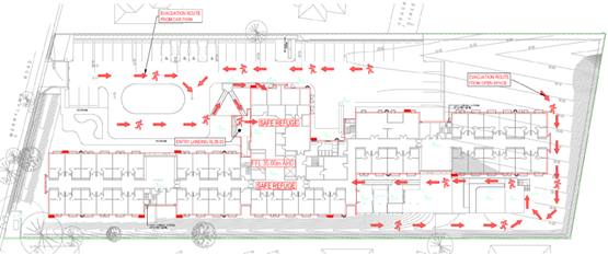 - Ground Floor: 42 suites, reception/lobby, common dining rooms, outdoor landscaped courtyard/gardens, nurse stations, kitchen, staff rooms, offices, linen room, cleaner’s rooms, waste rooms, and mechanical plant room.