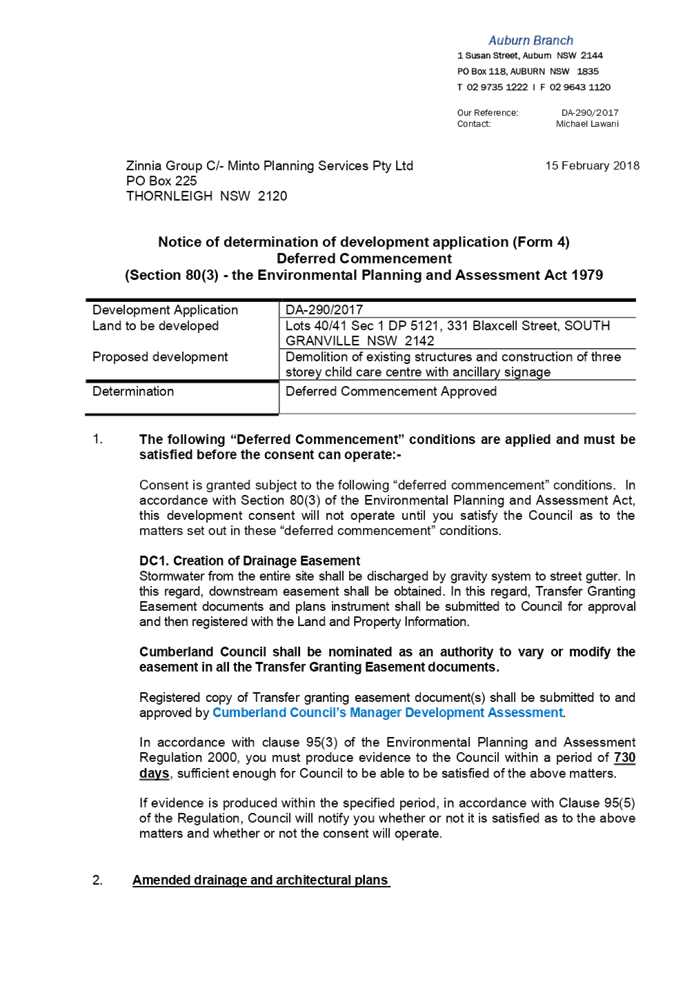 That Modification Application MOD2021/0156 being a Section 4.56 modification for alterations to an approved childcare centre including a reconfiguration of the ground floor parking area, revision to internal and external areas of the upper levels and provision of an external fire stair on land at 331 Blaxcell Street, South Granville be approved subject to attached conditions listed in the attached schedule. |