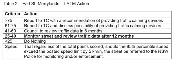 Therefore, the installation of traffic calming devices on Earl Street, Merrylands cannot be supported. The recorded 85th percentile speed of 51km/hr is within acceptable limits.