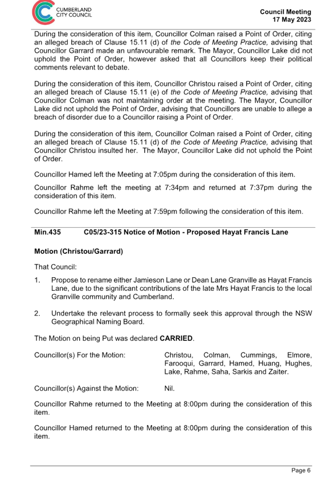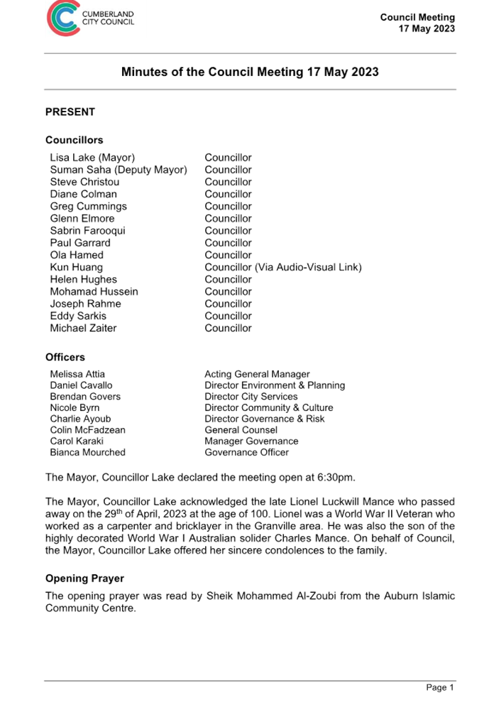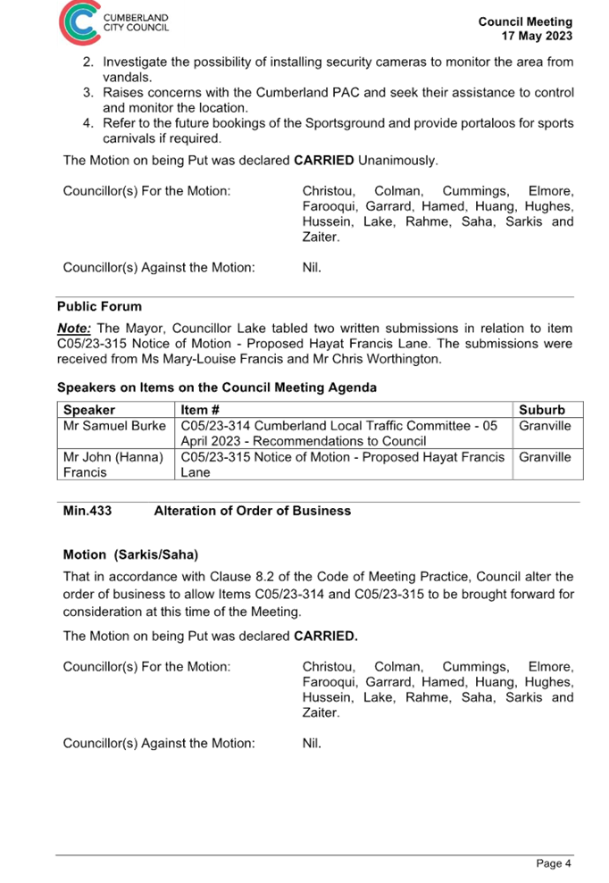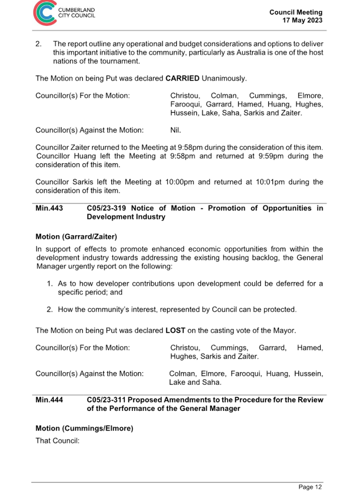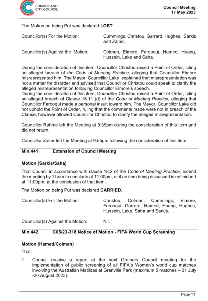 “1. Council receive a report at the next Ordinary Council meeting for the implementation of public screening of all FIFA’s Women’s world cup matches involving the Australian Matildas at Granville Park (maximum 5 matches – 31 July - 20 August 2023).