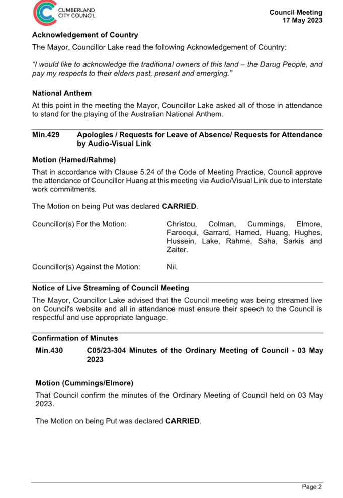 2 Opening Prayer / Acknowledgement of Country / National Anthem