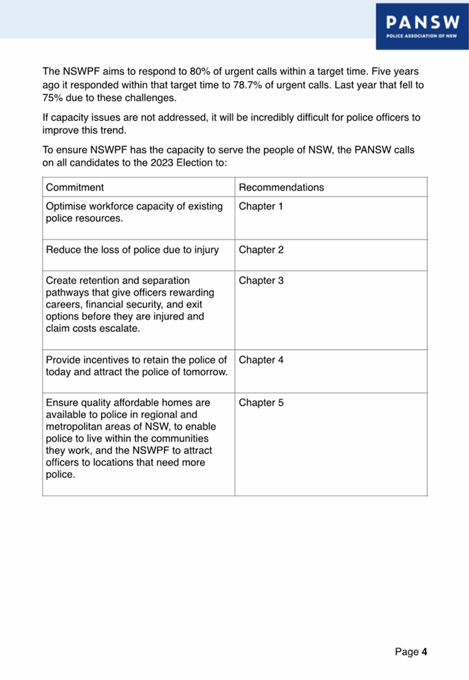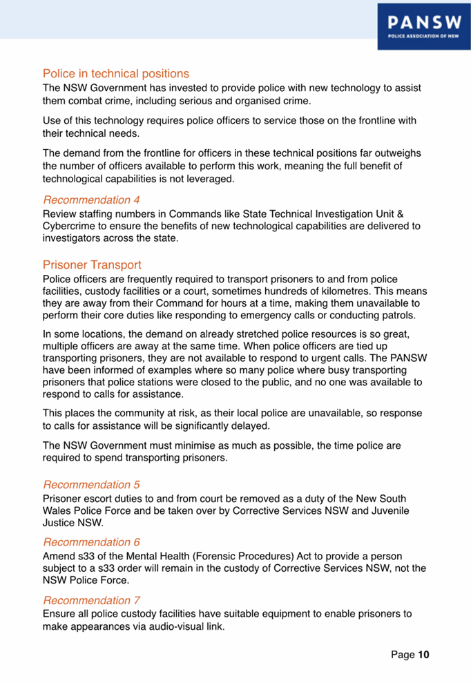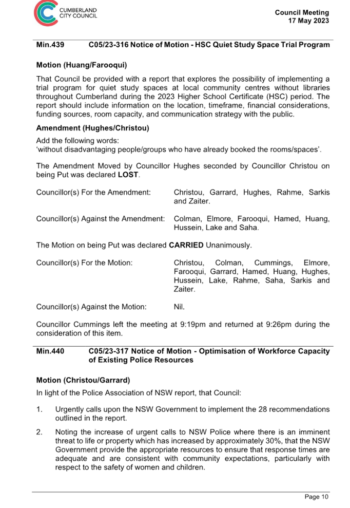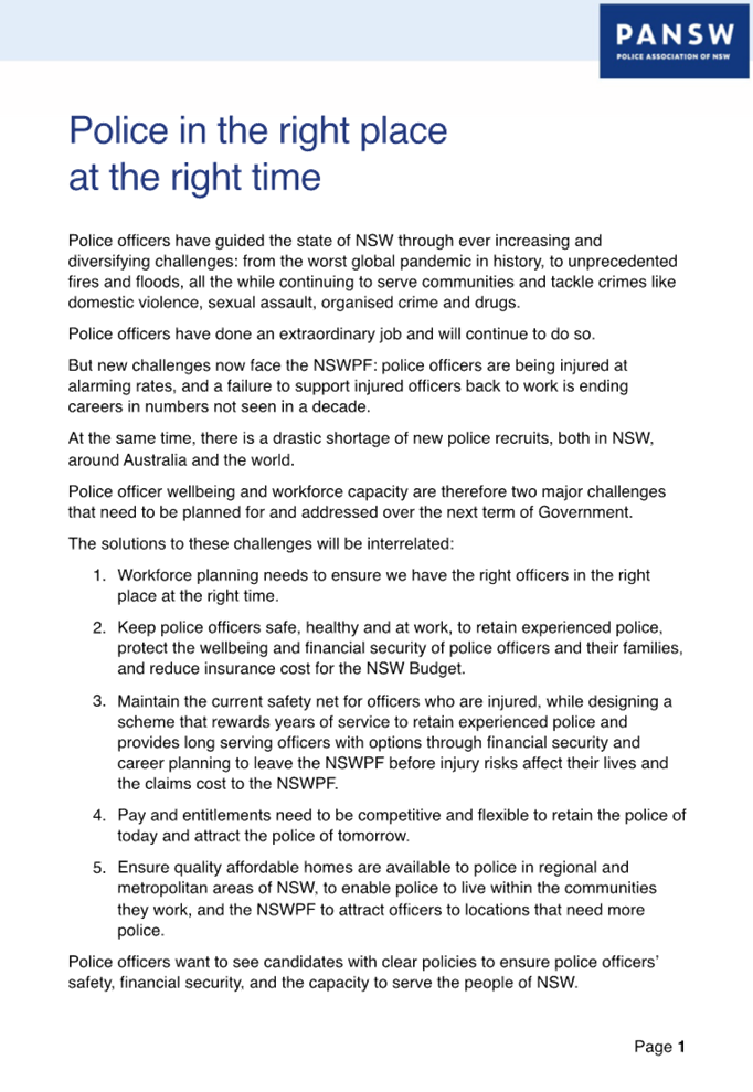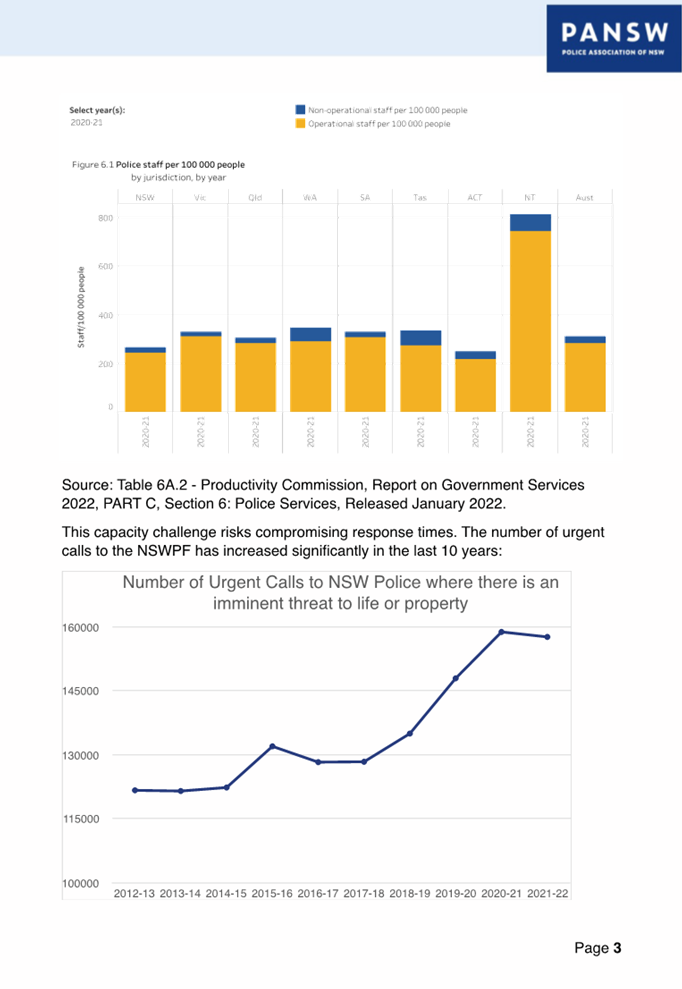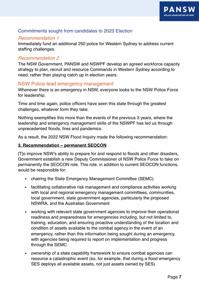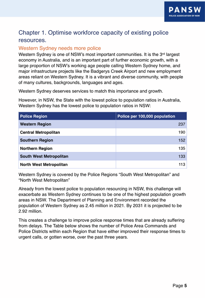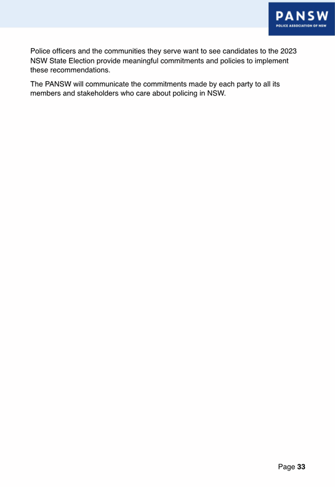 Notice of Motion That Council: 1. Urgently calls upon the NSW Government to implement the 28 recommendations outlined in the attached Police Association of NSW 2023 document titled “Election issues – 28 recommendations.” 2. Noting that the document references an increase of approximately 30% in urgent calls to NSW Police over a 10 year period where there is an imminent threat to life or property, calls upon the NSW Government to urgently provide NSW Police with appropriate resources to ensure that response times are adequate and are consistent with community expectations in Western Sydney, particularly with respect to the safety of women and children. 3. Write to our local MP’s seeking their urgent support and advocacy on this matter. |