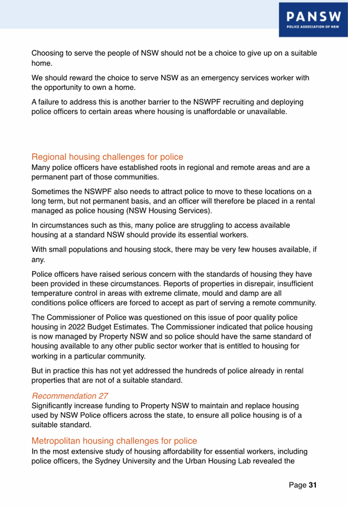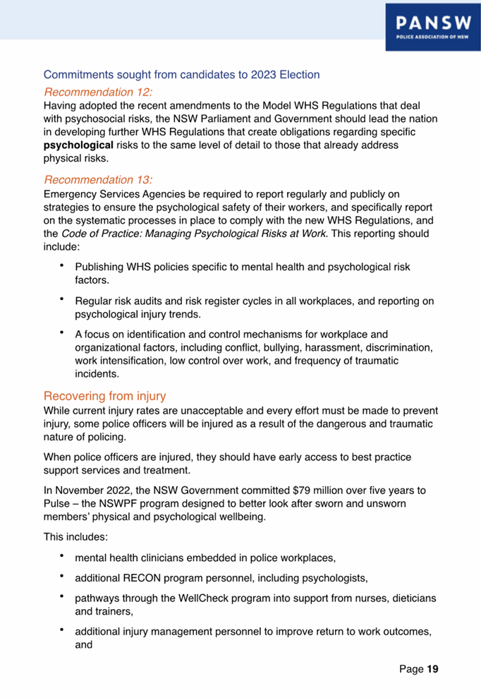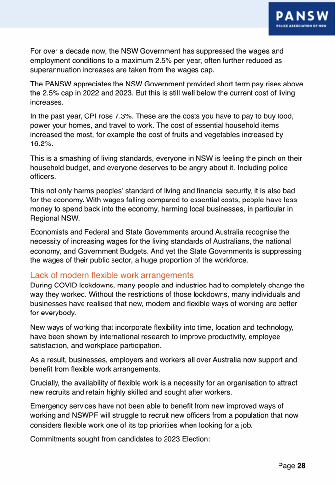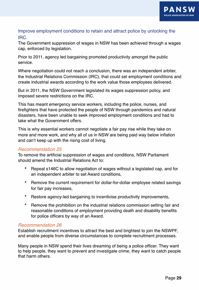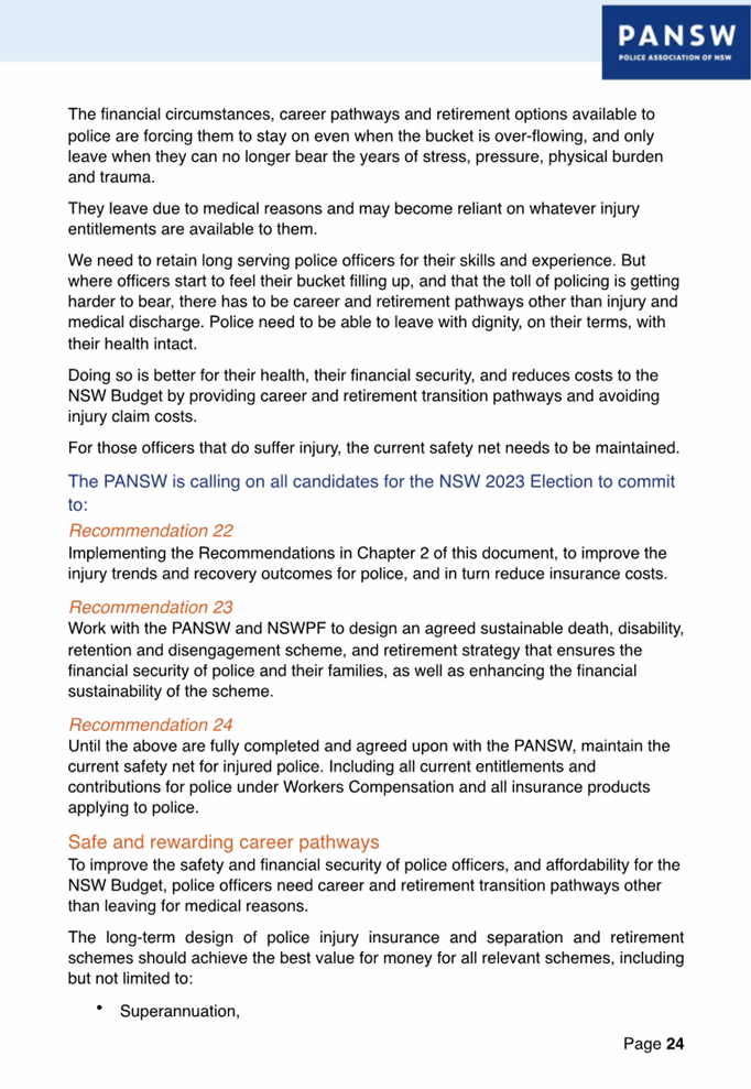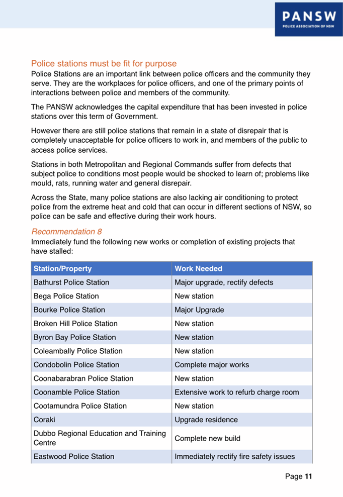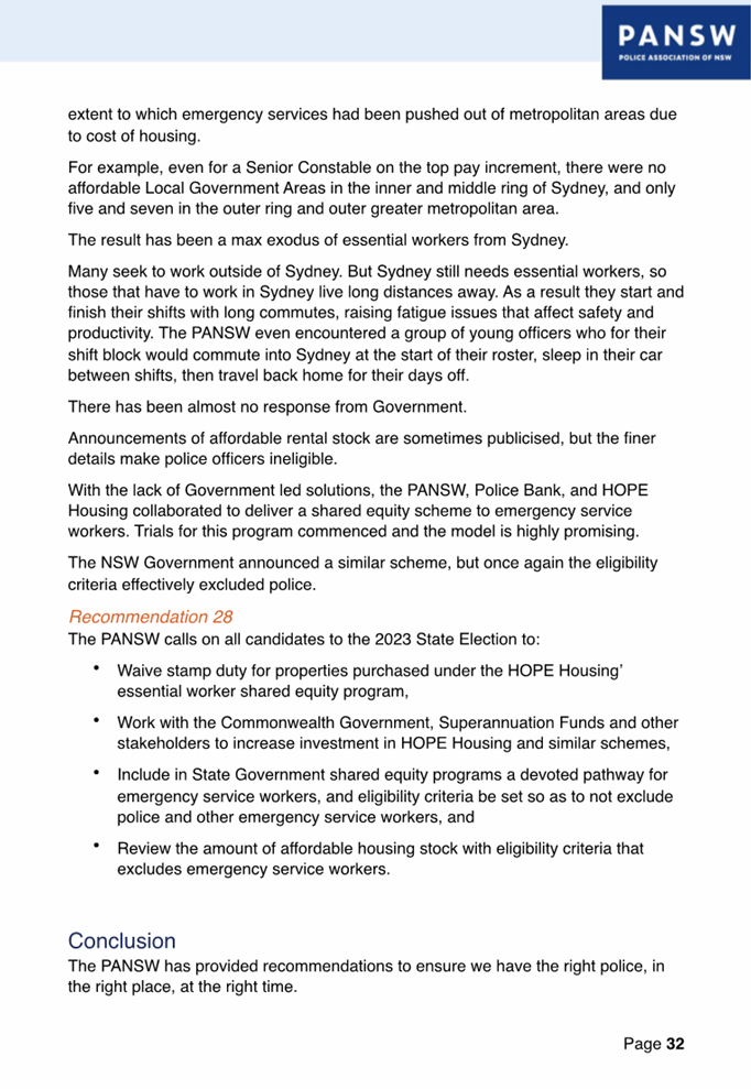 Notice of Motion That Council: 1. Urgently calls upon the NSW Government to implement the 28 recommendations outlined in the attached Police Association of NSW 2023 document titled “Election issues – 28 recommendations.” 2. Noting that the document references an increase of approximately 30% in urgent calls to NSW Police over a 10 year period where there is an imminent threat to life or property, calls upon the NSW Government to urgently provide NSW Police with appropriate resources to ensure that response times are adequate and are consistent with community expectations in Western Sydney, particularly with respect to the safety of women and children. 3. Write to our local MP’s seeking their urgent support and advocacy on this matter. |