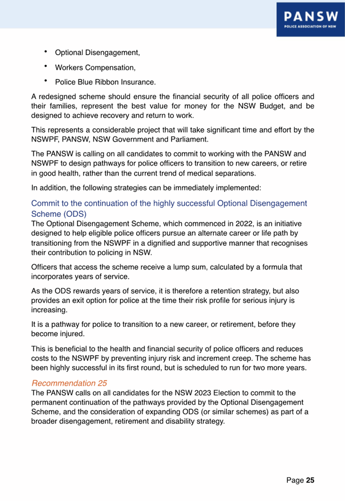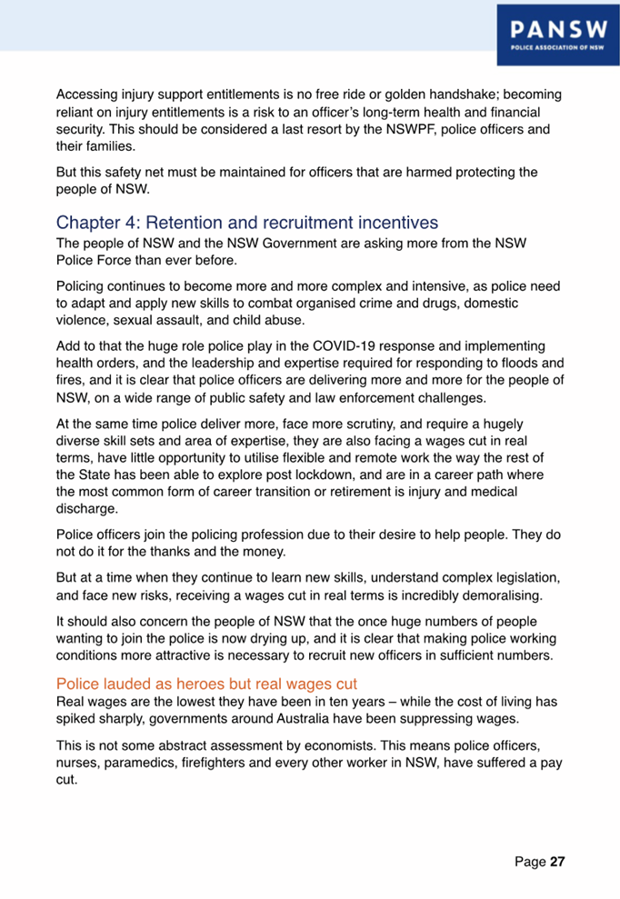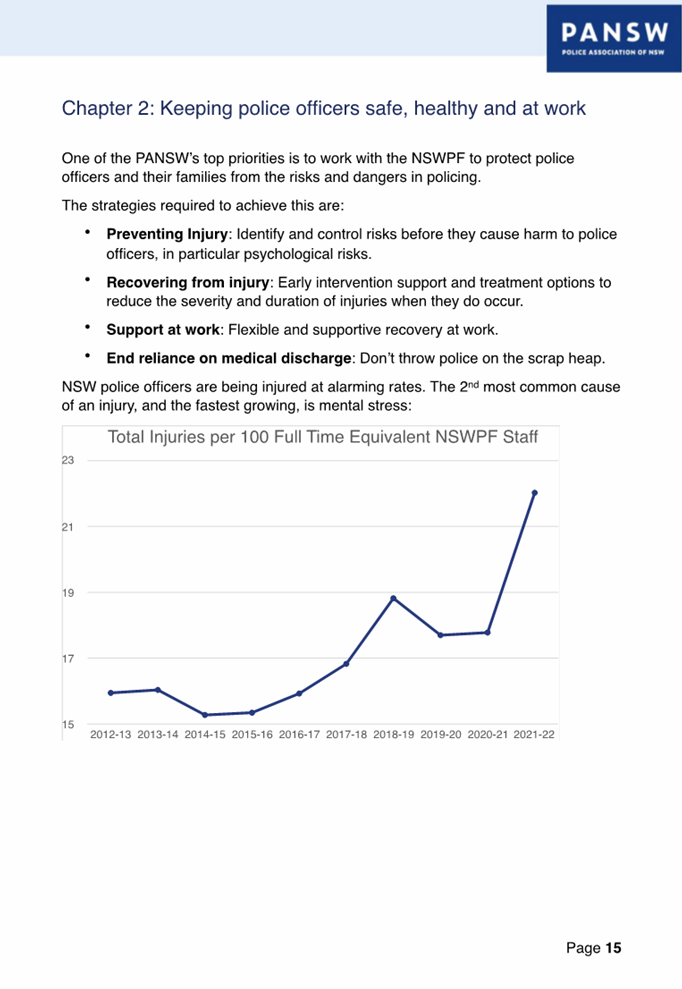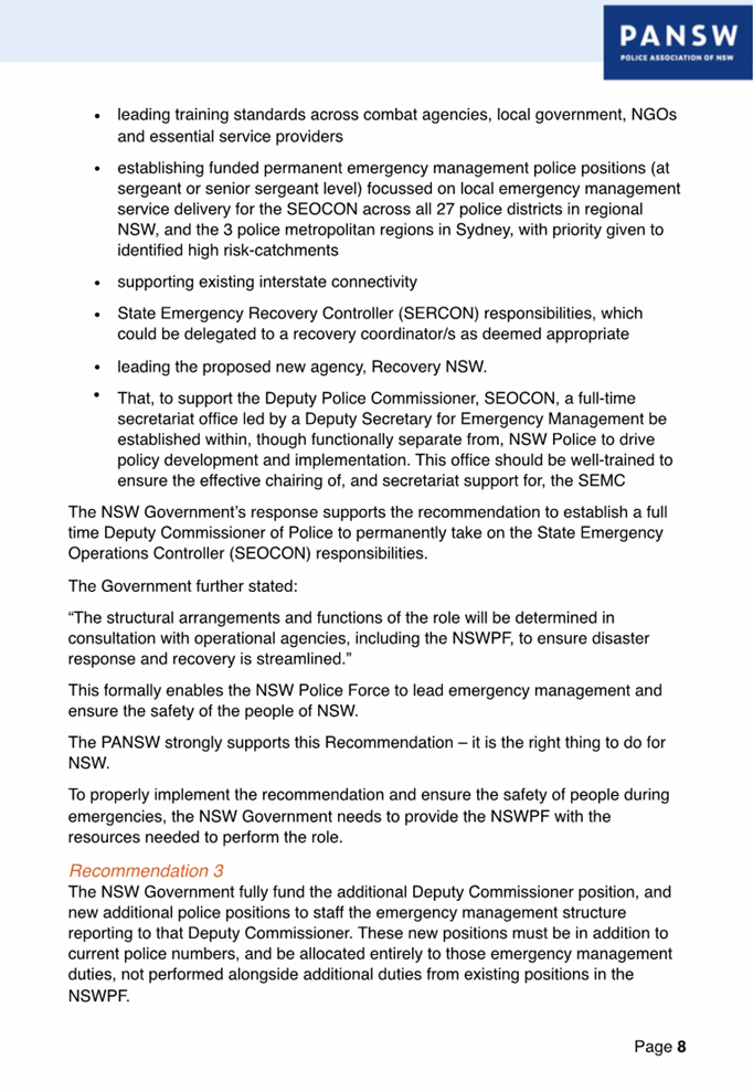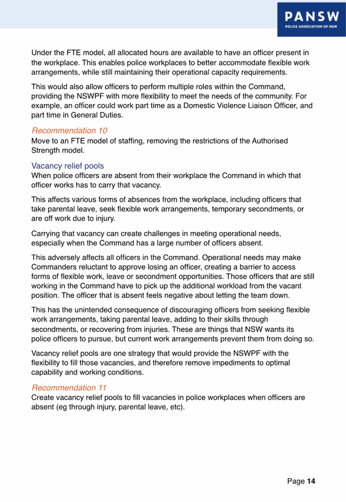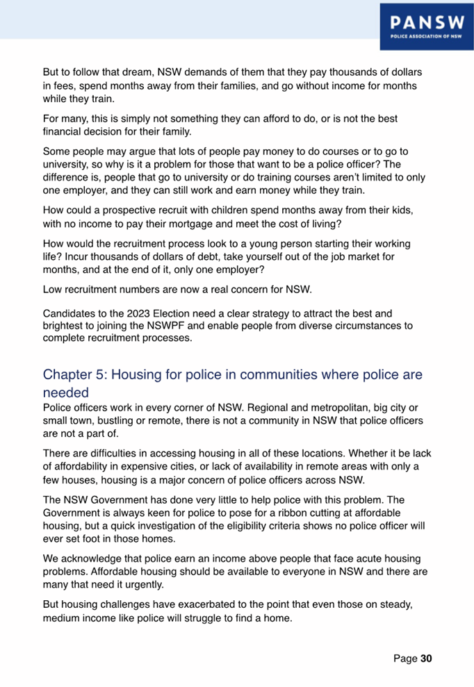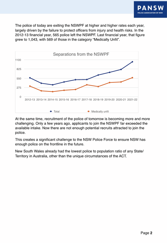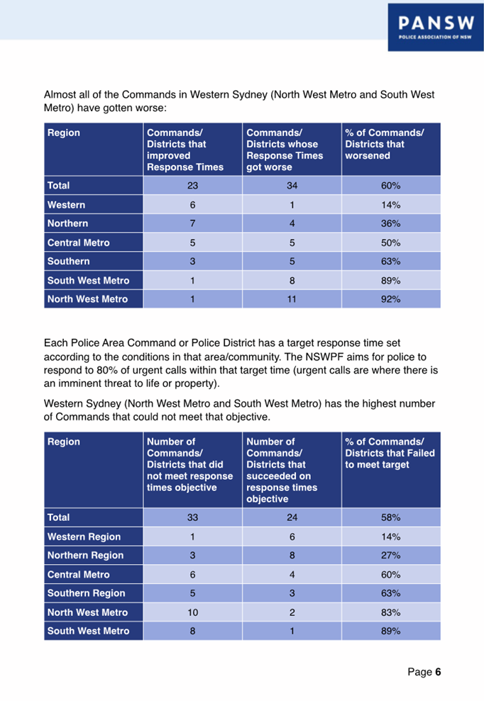 Notice of Motion That Council: 1. Urgently calls upon the NSW Government to implement the 28 recommendations outlined in the attached Police Association of NSW 2023 document titled “Election issues – 28 recommendations.” 2. Noting that the document references an increase of approximately 30% in urgent calls to NSW Police over a 10 year period where there is an imminent threat to life or property, calls upon the NSW Government to urgently provide NSW Police with appropriate resources to ensure that response times are adequate and are consistent with community expectations in Western Sydney, particularly with respect to the safety of women and children. 3. Write to our local MP’s seeking their urgent support and advocacy on this matter. |