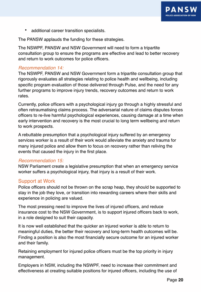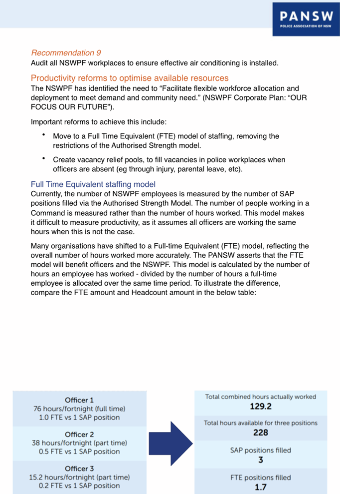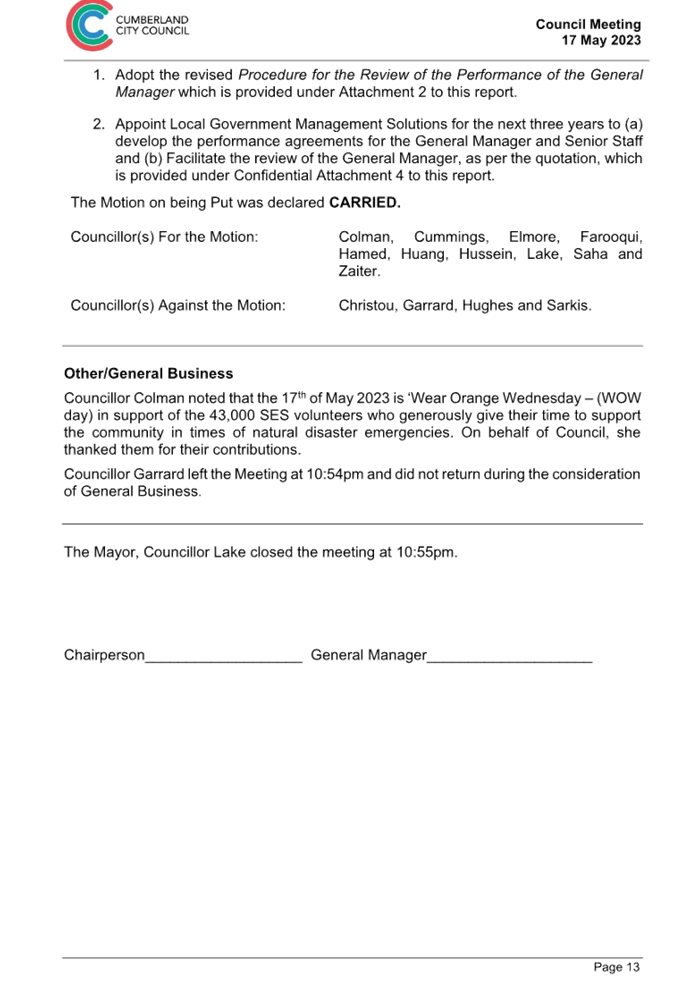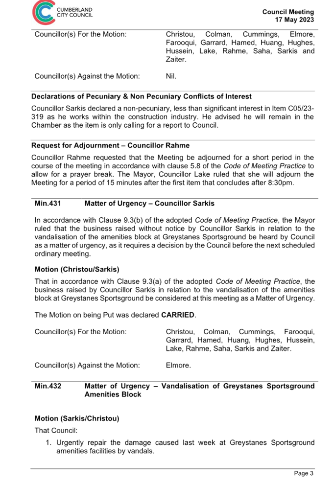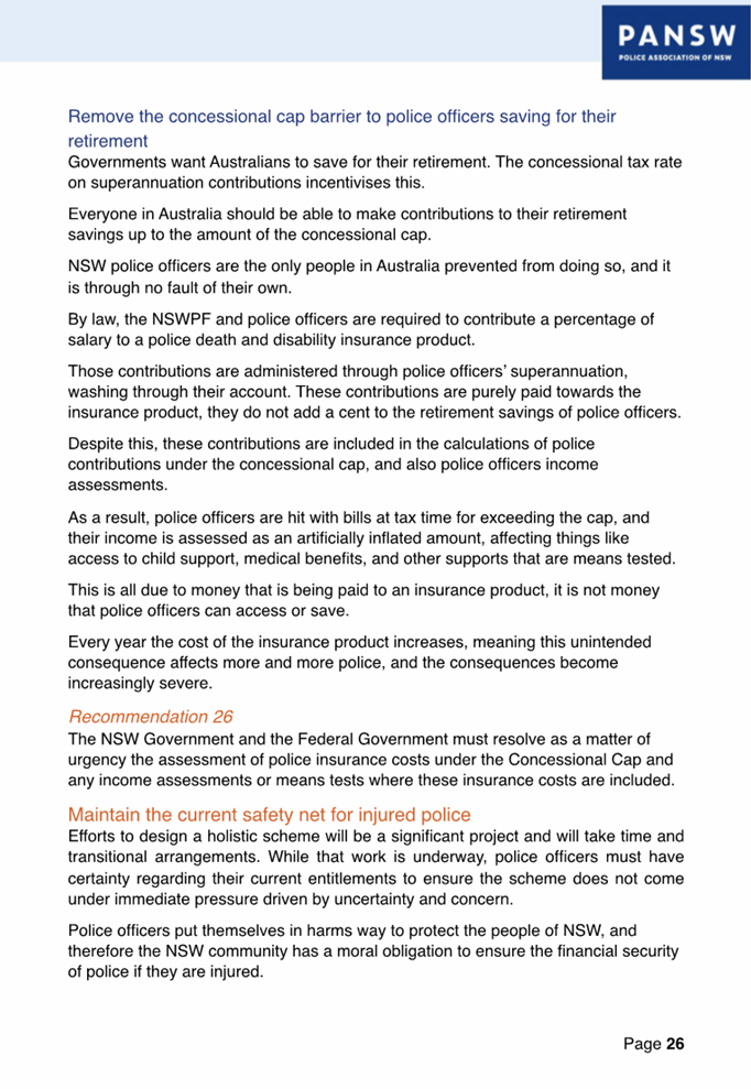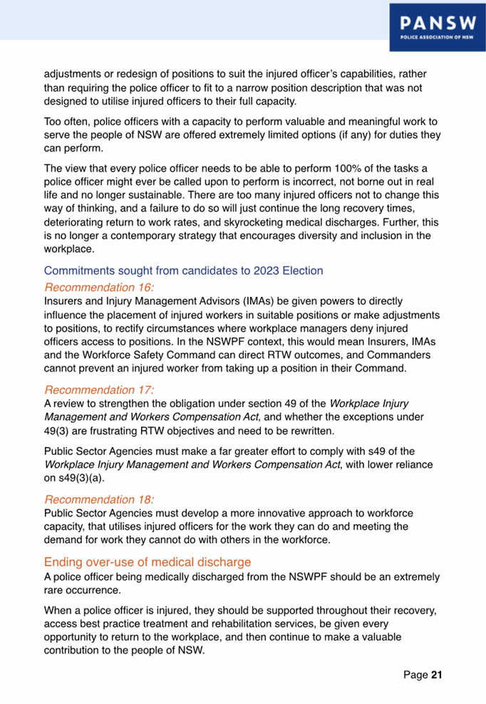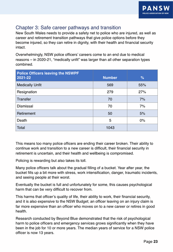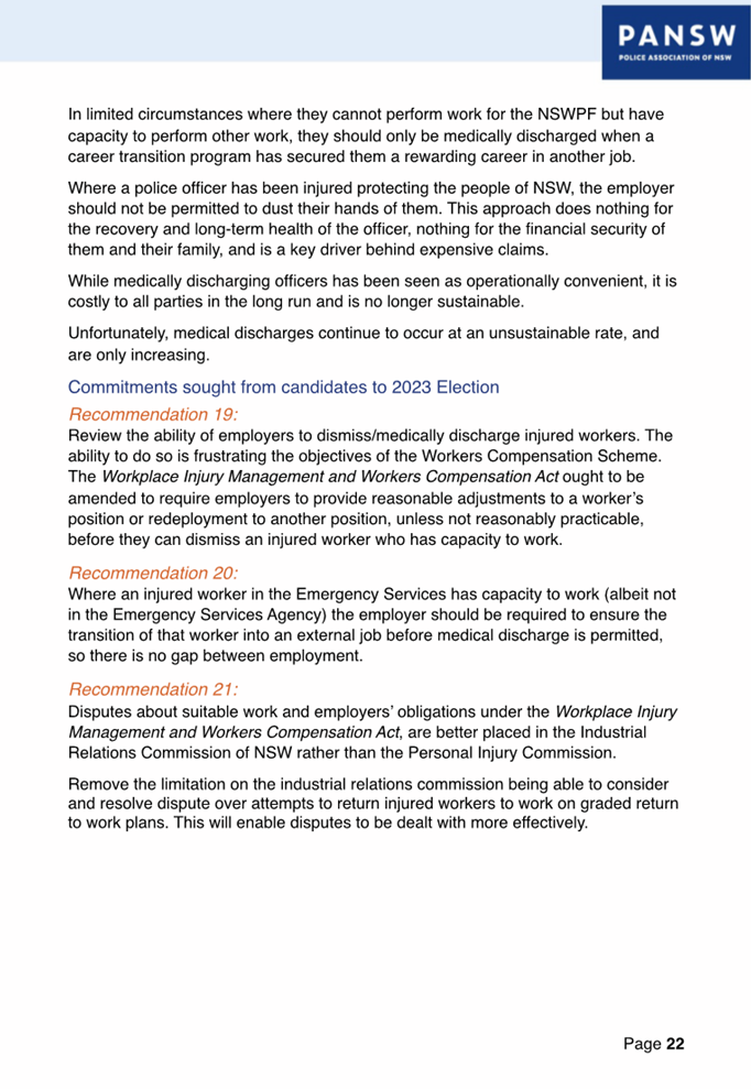 Notice of Motion That Council: 1. Urgently calls upon the NSW Government to implement the 28 recommendations outlined in the attached Police Association of NSW 2023 document titled “Election issues – 28 recommendations.” 2. Noting that the document references an increase of approximately 30% in urgent calls to NSW Police over a 10 year period where there is an imminent threat to life or property, calls upon the NSW Government to urgently provide NSW Police with appropriate resources to ensure that response times are adequate and are consistent with community expectations in Western Sydney, particularly with respect to the safety of women and children. 3. Write to our local MP’s seeking their urgent support and advocacy on this matter. |