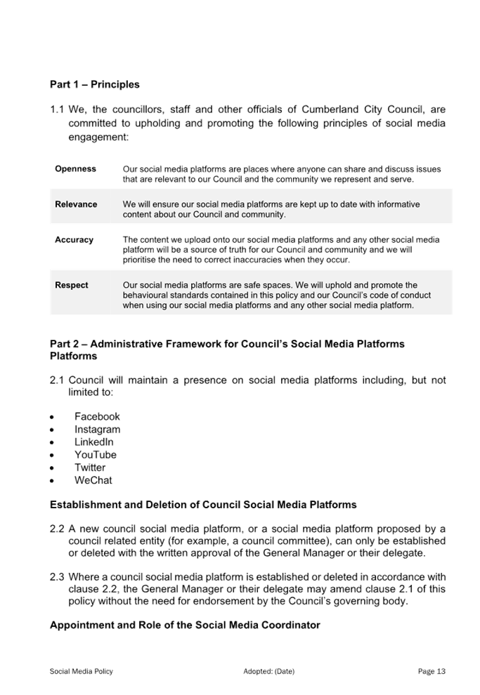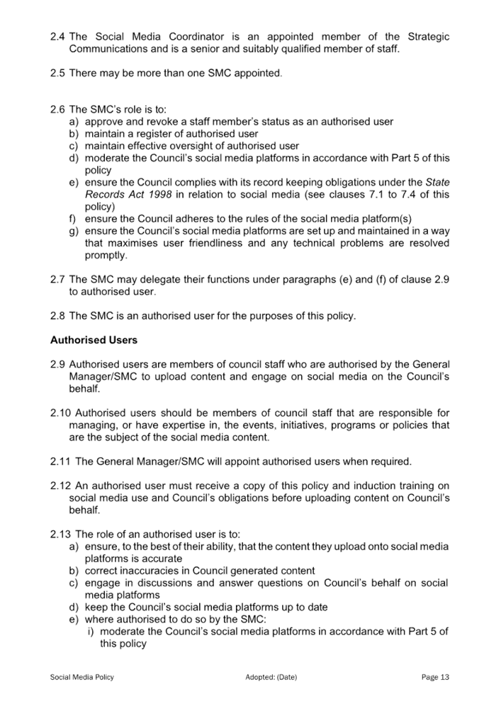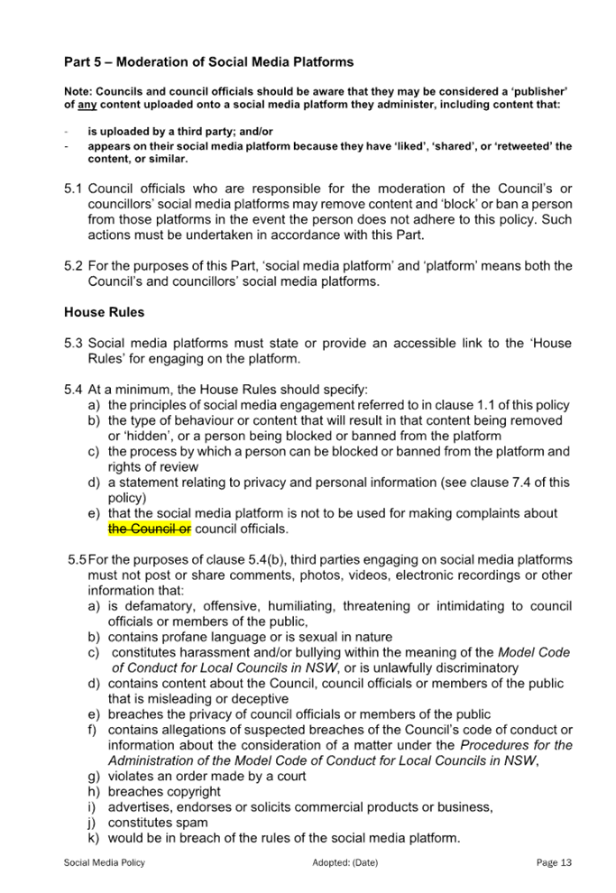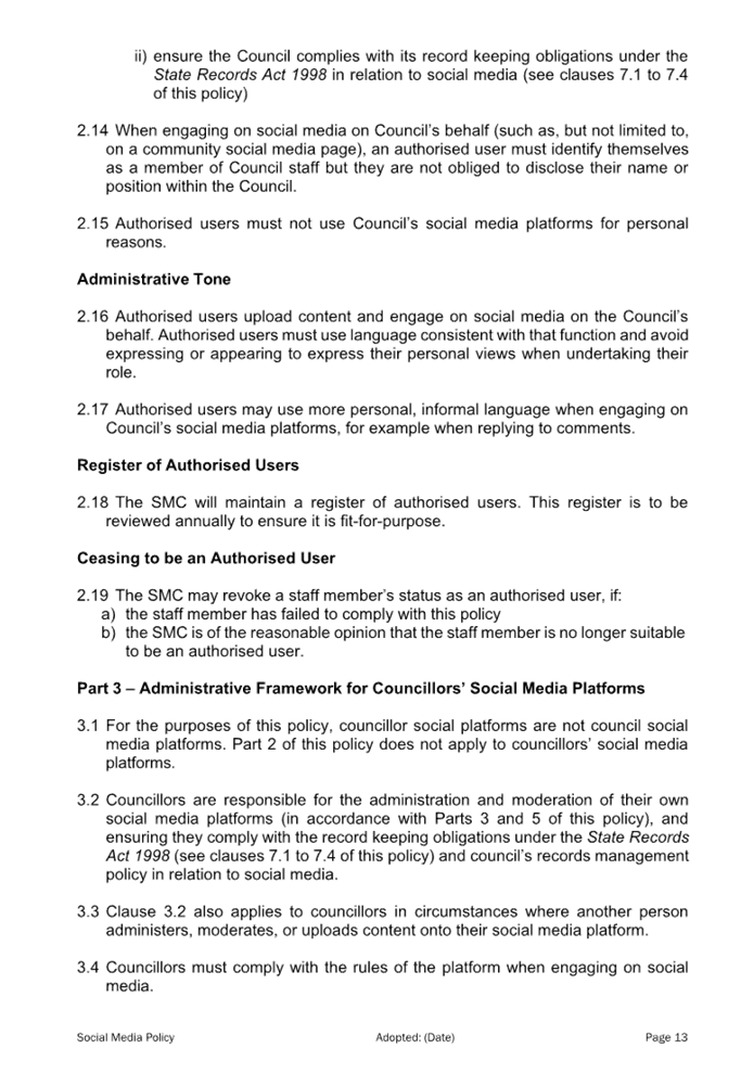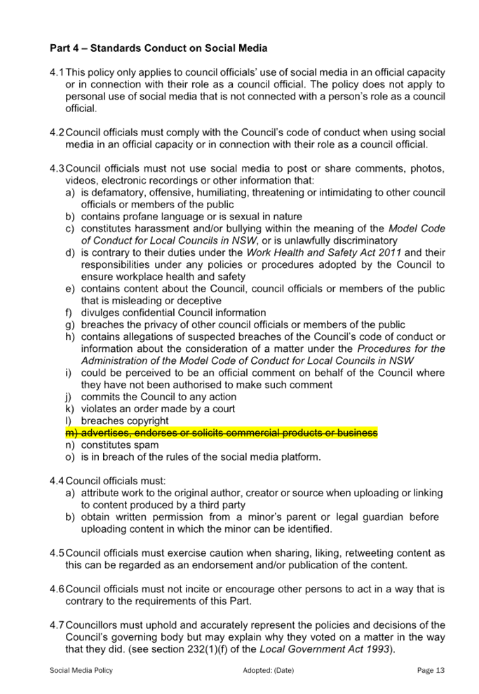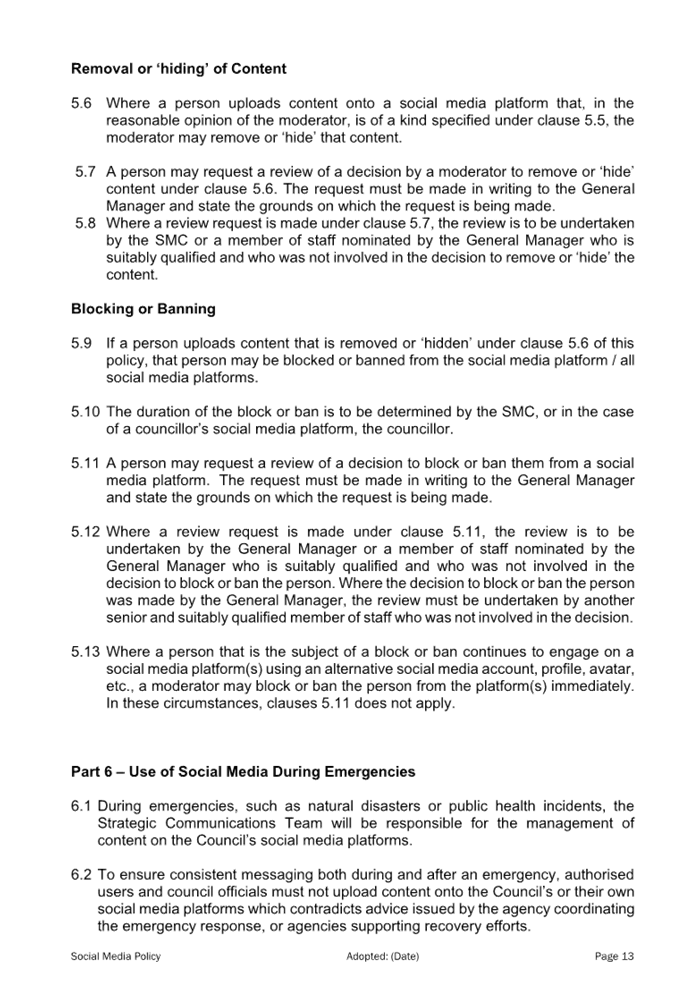 It should also be noted that Council also resolved to omit Clause 4.3(m) and remove the words ‘the Council or’ from Clause 5.4(e) from the Draft Social Media Policy (Min.298). Council subsequently received a Notice of Motion to alter the Council resolution at the Ordinary Meeting of Council held 21 December 2022, however, the Motion on being Put was lost.
