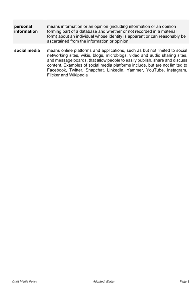 Recommendation That Council adopt the Draft Social Media Policy and Draft Media Policy as contained in Attachments 1 and 2 of this report. |