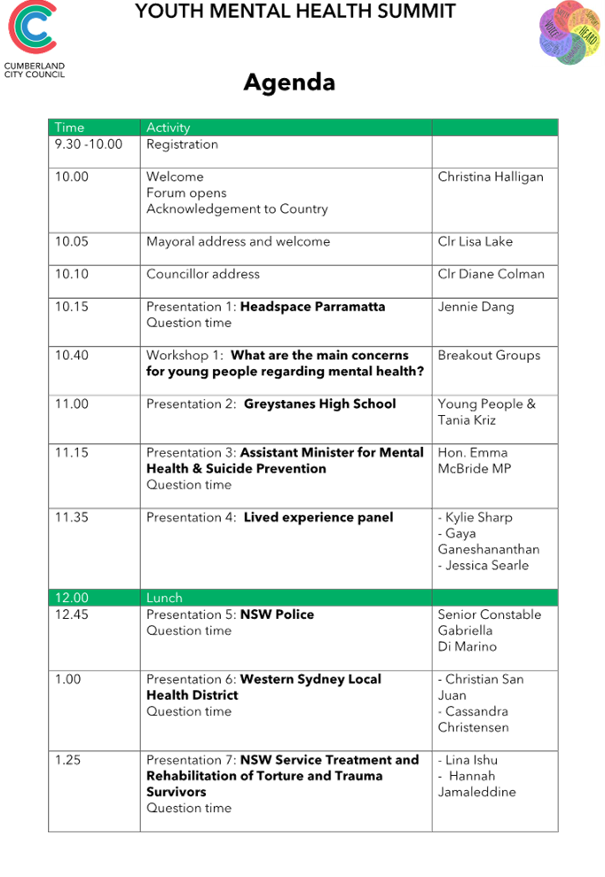 The Youth Mental Health Summit was held on 28 February and consisted of presentations from organisations including but not limited to, Youth Health, NSW Police, and Youth Off The Streets. State and Federal Ministers attended the Summit with the Assistant Minister for Mental Health and Suicide Prevention, The Honourable Emma McBride MP addressing participants.