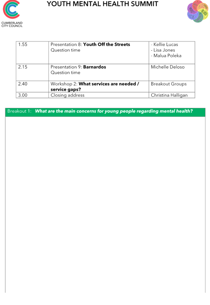 Council consulted with the youth sector of Cumberland in the lead up to the Summit, with their input informing the run-sheet and logistics including location and duration.