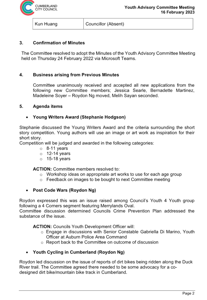 2. Minutes - Youth Advisory Committee Meeting 16 February 2023