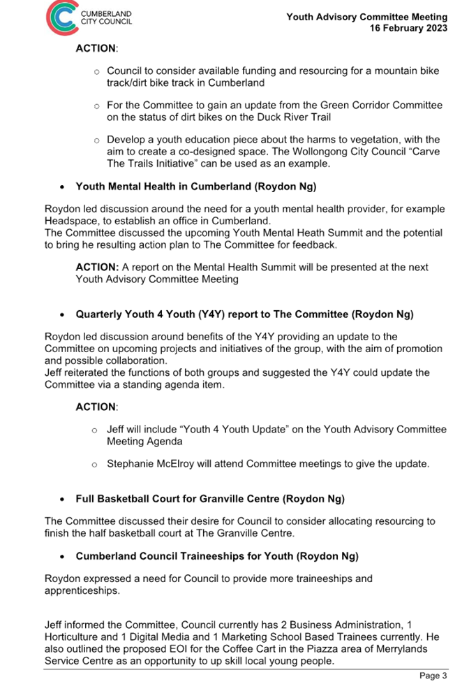 At the Youth Advisory Committee Meeting held on 16 February 2023 the following action was minuted after a discussion regarding youth mental health: