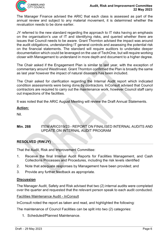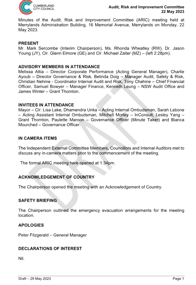 C06/23-325 Audit, Risk and Improvement Committee - Draft Minutes of Meeting Held on 22 May 2023............................................................................................. 133