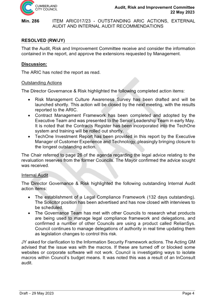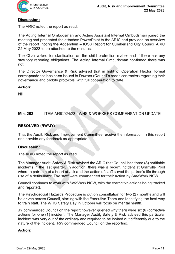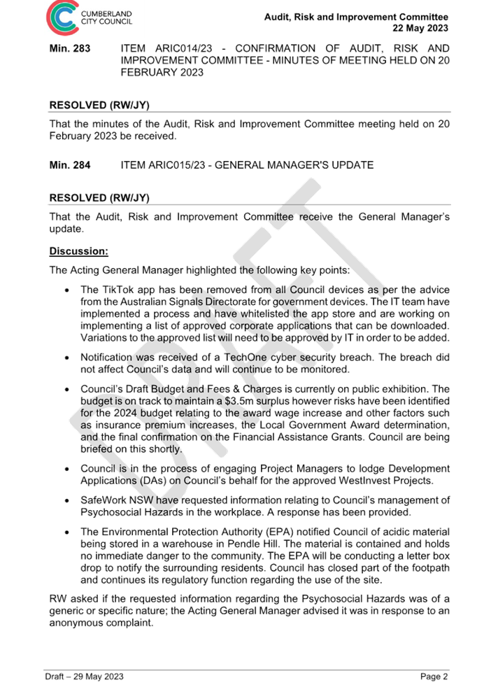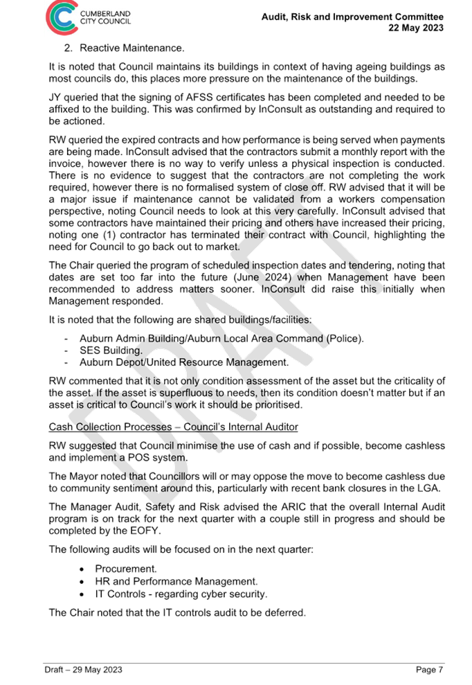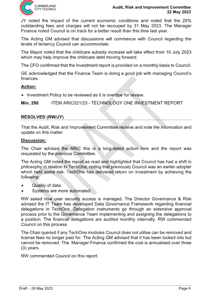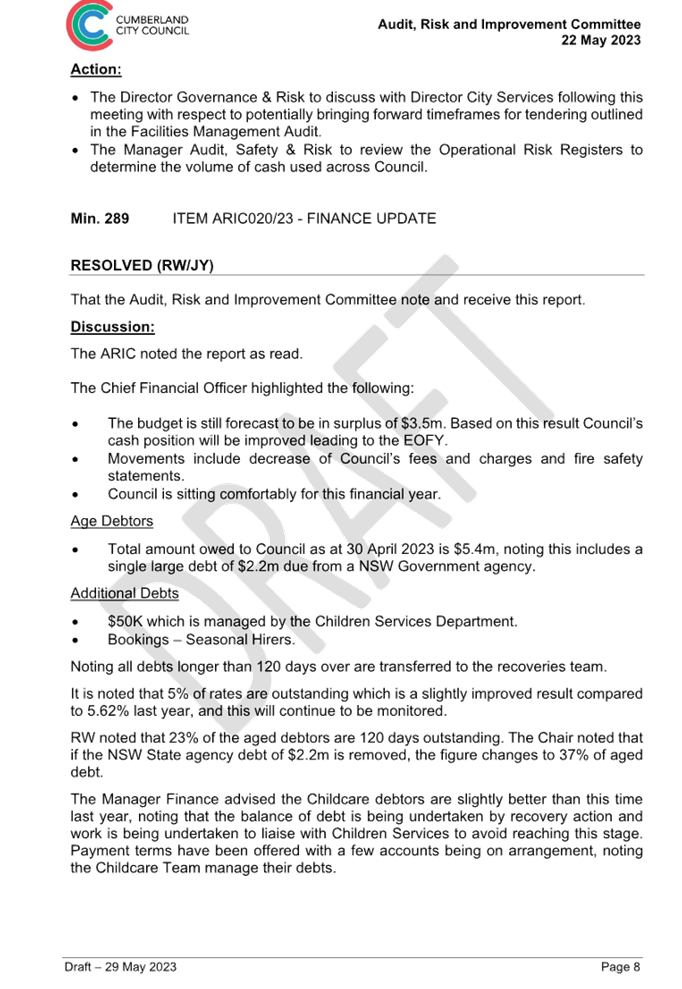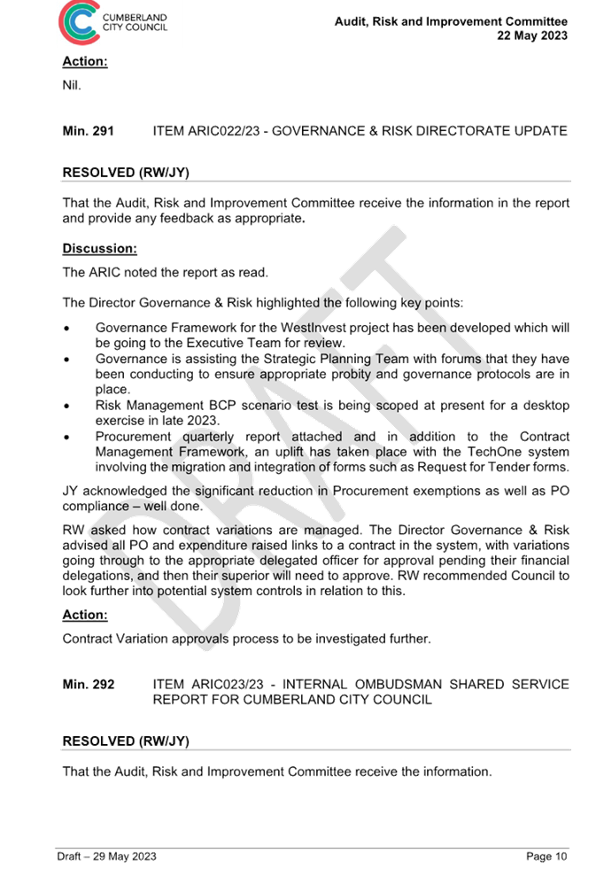 This report presents the Draft Minutes of the Audit, Risk and Improvement Committee meeting held on 22 May 2023 for Council’s information.