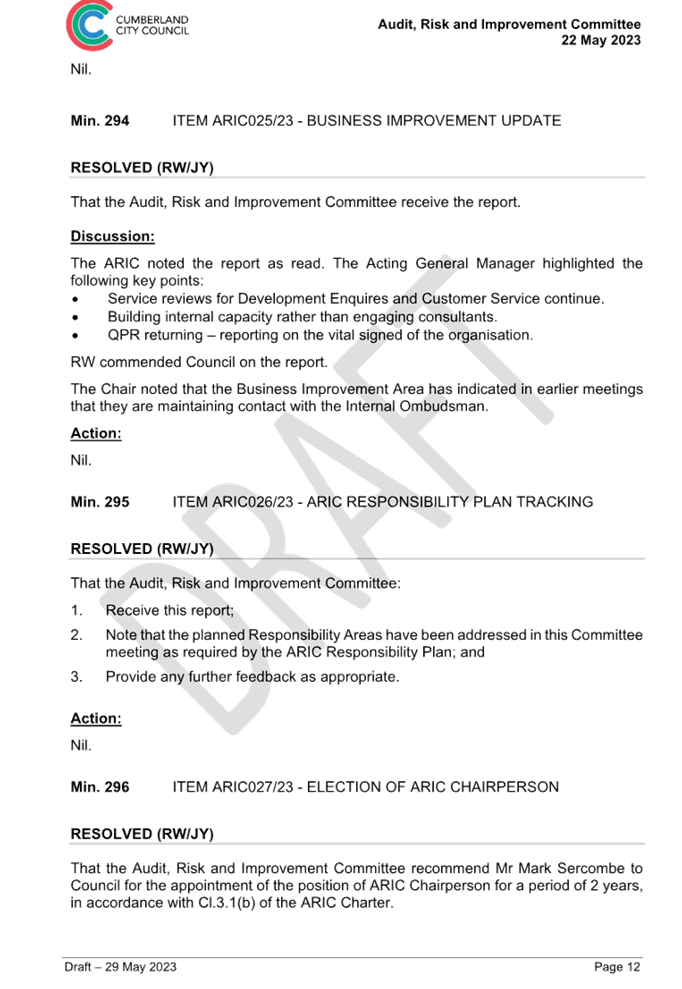 Recommendation That Council: 1. Receive the Draft Minutes of the Audit, Risk and Improvement Committee meeting held on 22 May 2023; and 2. Appoint Mr Mark Sercombe as the Chairperson of the Audit, Risk and Improvement Committee for a period of 2 years, in accordance with the recommendation of the Committee. |