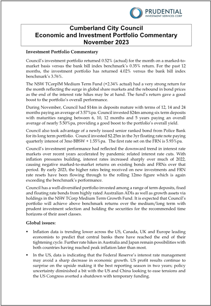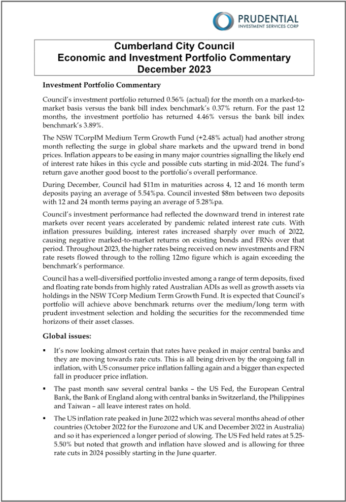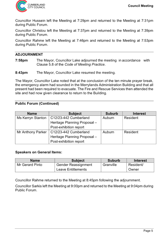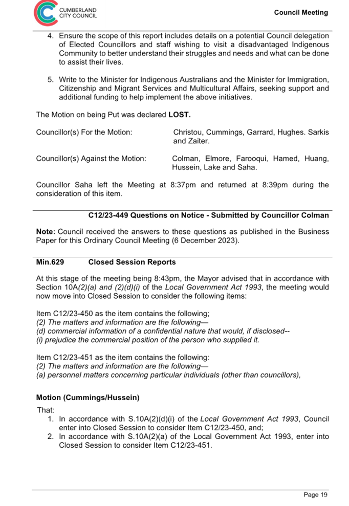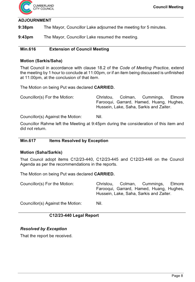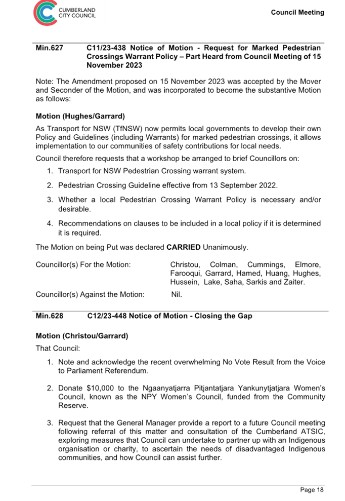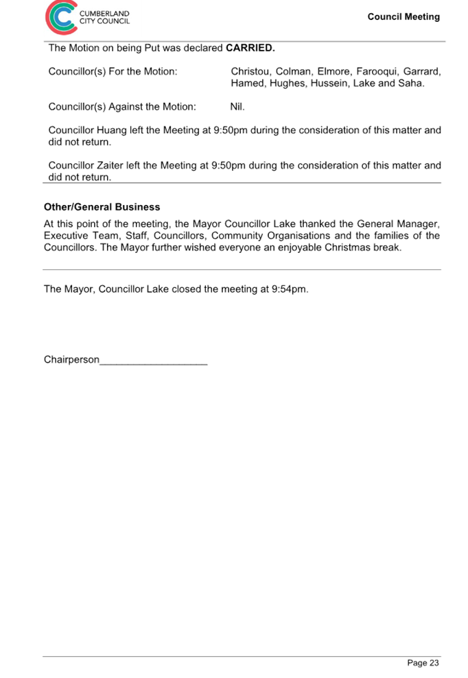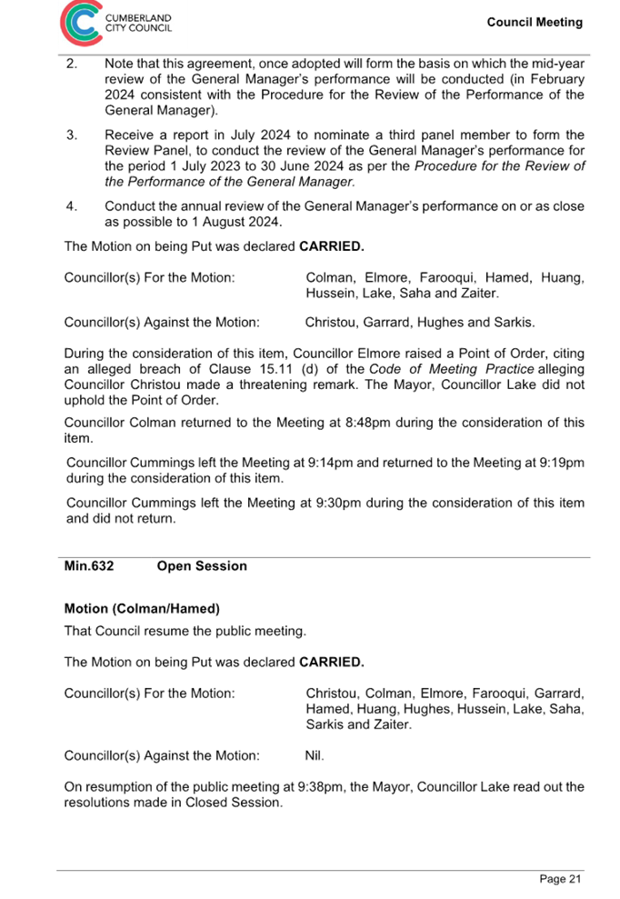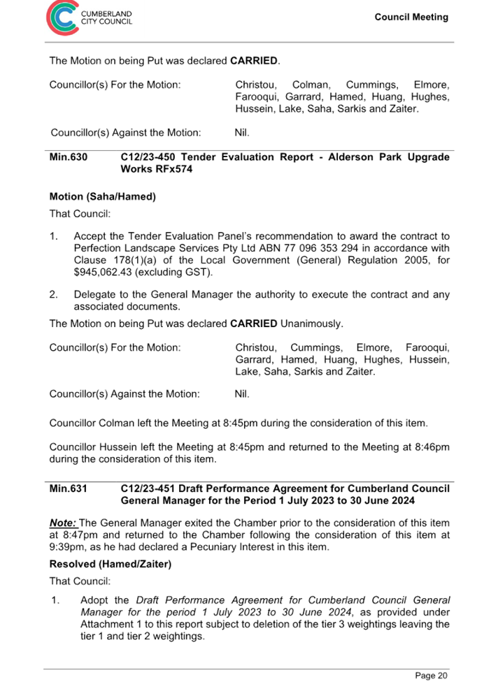 Min.631 That Council: 1. Adopt the Draft Performance Agreement for Cumberland Council General Manager for the period 1 July 2023 to 30 June 2024, as provided under Attachment 1 to this report subject to deletion of the tier 3 weightings leaving the tier 1 and tier 2 weightings. 2. Note that this agreement, once adopted will form the basis on which the mid-year review of the General Manager’s performance will be conducted (in February 2024 consistent with the Procedure for the Review of the Performance of the General Manager). 3. Receive a report in July 2024 to nominate a third panel member to form the Review Panel, to conduct the review of the General Manager’s performance for the period 1 July 2023 to 30 June 2024 as per the Procedure for the Review of the Performance of the General Manager. 4. Conduct the annual review of the General Manager’s performance on or as close as possible to 1 August 2024. Motion That Council: 1. Adopt the Draft Performance Agreement for Cumberland Council General Manager for the period 1 July 2023 to 30 June 2024, as provided under Attachment 1 to this report subject to deletion of the tier 3 weightings leaving the tier 1 and tier 2 weightings subject to the following inclusions: - That the General manager undertake initiatives to improve compliance around illegally parked trucks on residential roads - That the town centres cleanliness be improved - That customer service performance be improved whereby staff become more accountable to ratepayer requests 2. Note that this agreement, once adopted will form the basis on which the mid-year review of the General Manager’s performance will be conducted (in February 2024 consistent with the Procedure for the Review of the Performance of the General Manager). 3. Receive a report in July 2024 to nominate a third panel member to form the Review Panel, to conduct the review of the General Manager’s performance for the period 1 July 2023 to 30 June 2024 as per the Procedure for the Review of the Performance of the General Manager. 4. Conduct the annual review of the General Manager’s performance on or as close as possible to 1 August 2024. |