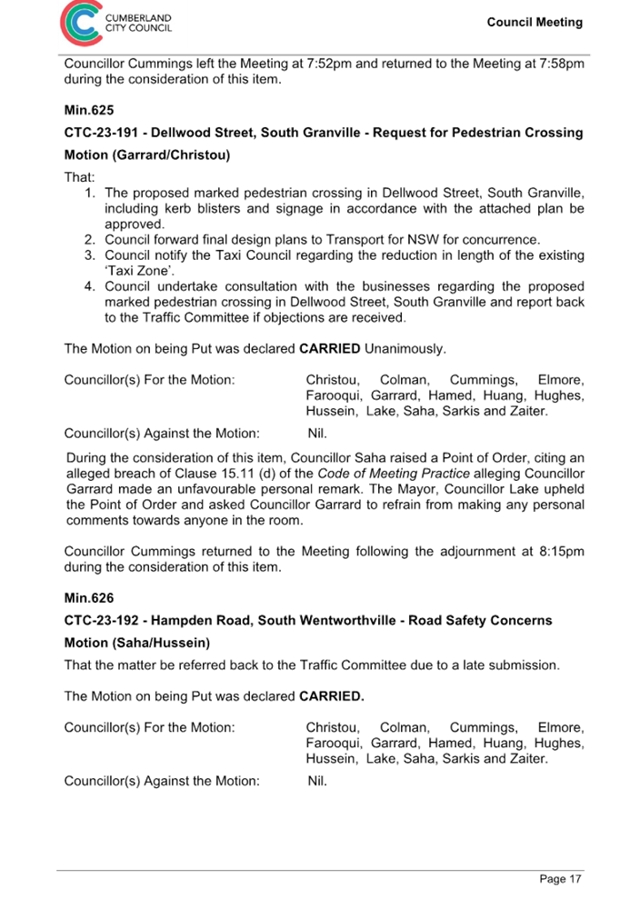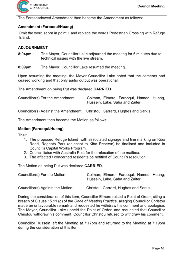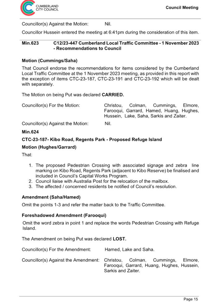 Min.624 That: 1. The proposed Refuge Island with associated signage and line marking on Kibo Road, Regents Park (adjacent to Kibo Reserve) be finalised and included in Council’s Capital Works Program. 2. Council liaise with Australia Post for the relocation of the mailbox. 3. The affected / concerned residents be notified of Council’s resolution. Motion That the proposed Pedestrian Crossing with associated signage and zebra line marking on Kibo Road, Regents Park (adjacent to Kibo Reserve) be finalised in accordance with the plan and included in Council’s Capital Works Program by a referral back to the Traffic Committee. |