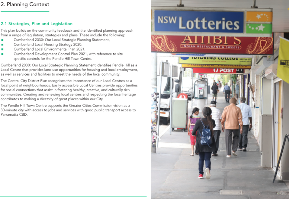 The Plan will support place-based outcomes identified for Pendle Hill in Cumberland 2030: Our Local Strategic Planning Statement and is also aligned with Council’s Community Strategic Plan.