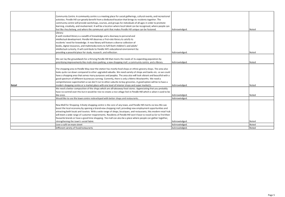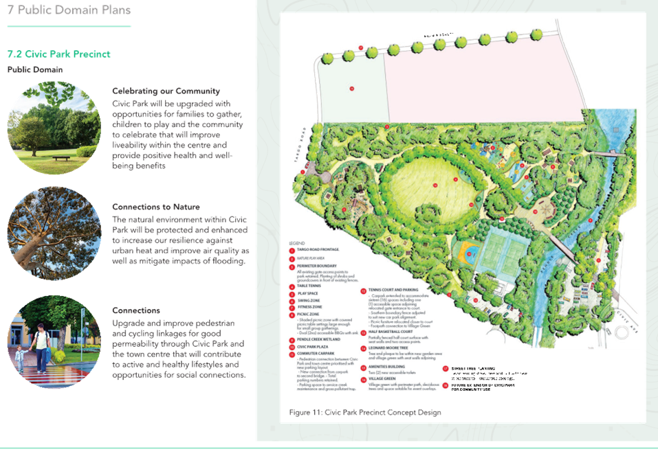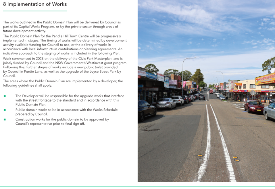 Public domain works identified in the Pendle Hill Town Centre Public Domain Plan will be included for consideration in Council’s capital works program. Development contributions have been collected and reserved for this purpose. The first stage of works under the Plan is for the upgrade of Civic Park in Pendle Hill, which is underway and received funding from Council and the NSW Government. Further grant opportunities to implement the plan will also be explored as they become available.