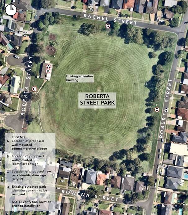 Recommendation That Council installs the proposed commemorative plaque in honour of the late Thomas (Tom) Adams and updated identification signage associated with the naming at Roberta Street Park, Greystanes, as outlined in this report. |