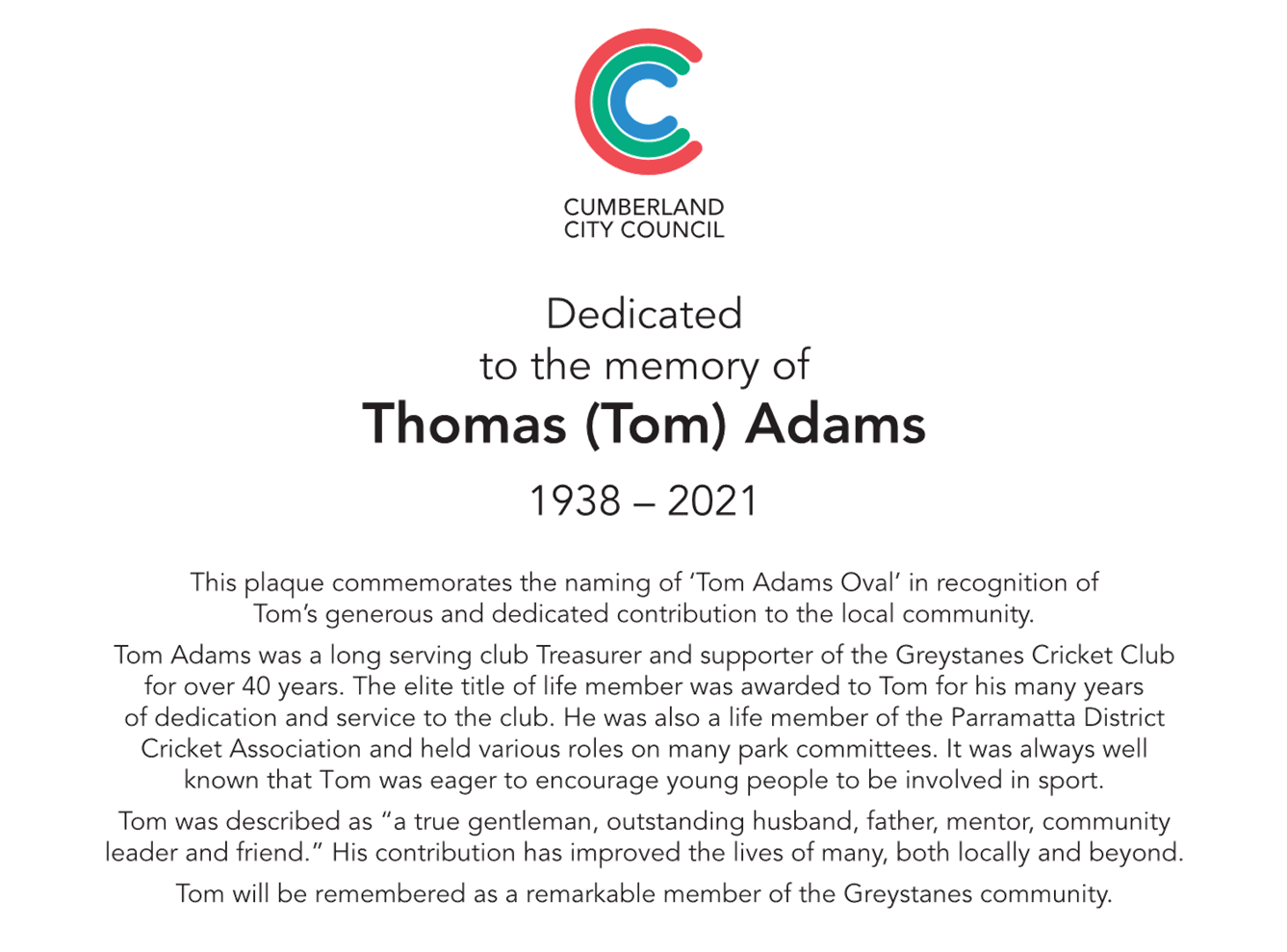Further to the resolution, Council consulted with the Greystanes Cricket Club and family of Tom Adams to confirm content and location preferences. This consultation resulted in the proposed commemorative plaque attached to this report, and consensus that the plaque be mounted on the field facing wall of the parks amenities building.