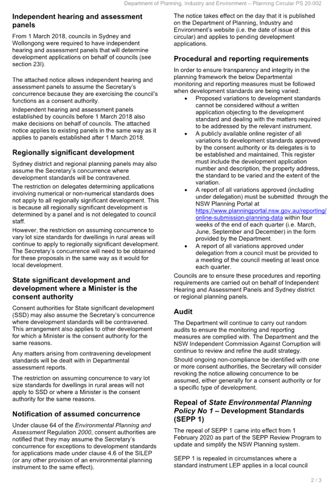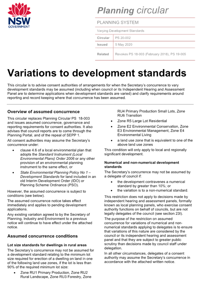 On 5 May 2020 the Department of Planning, Industry and Environment issued Planning Circular PS 20-002 Variations to Development Standards. The purpose of the circular is as follows: