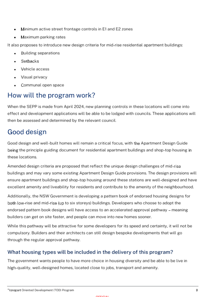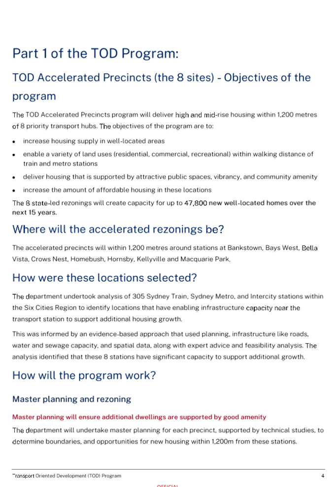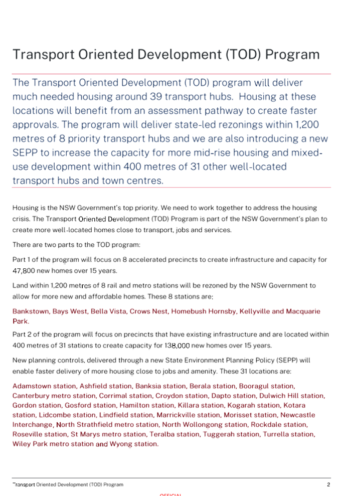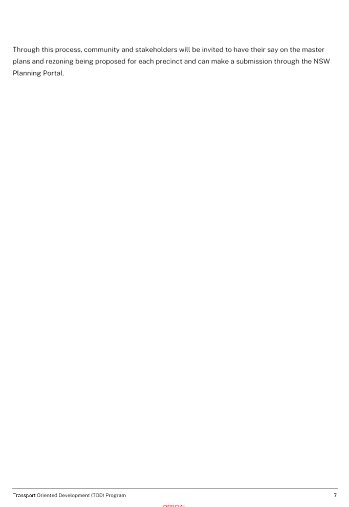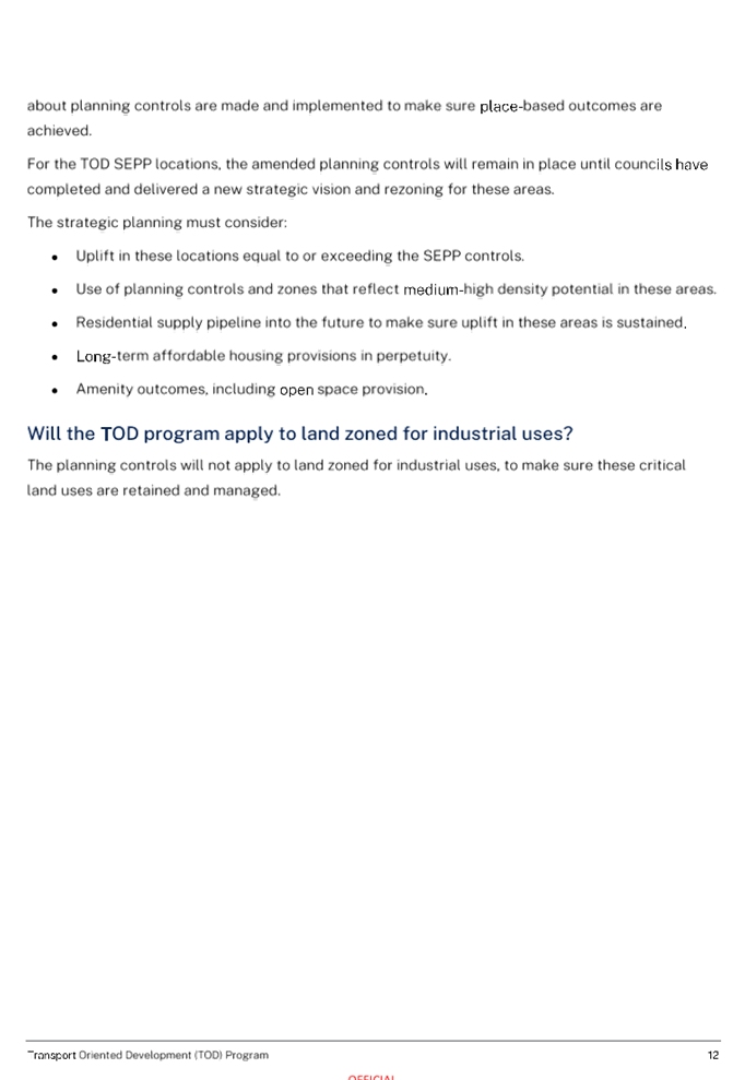 In December 2023, the NSW Government announced the Transport Oriented Development Program to facilitate additional housing with transport infrastructure. As part of this announcement, Lidcombe and Berala were identified in the Program, with a new State Environmental Planning Policy being prepared to allow for residential apartment buildings up to 6 levels to be built within 400m of these stations. It is noted that there are areas in Lidcombe and Berala under the Program that are currently not zoned for this level of development.