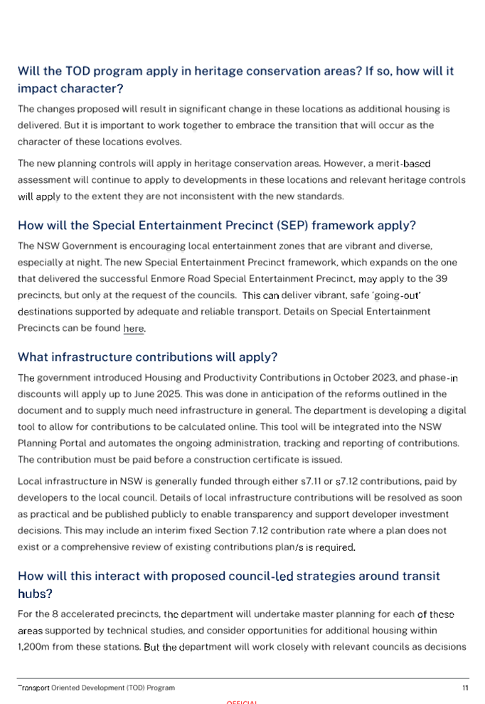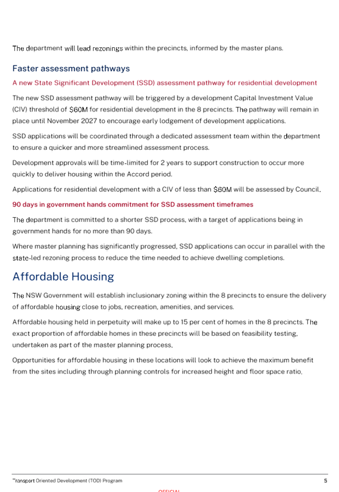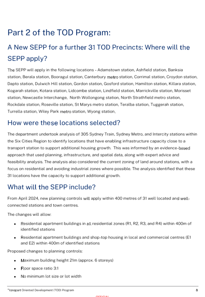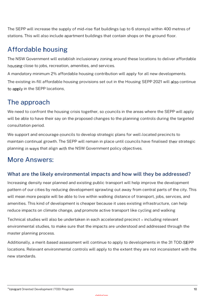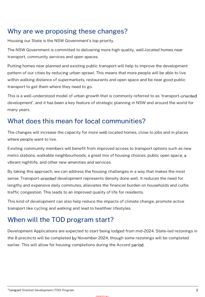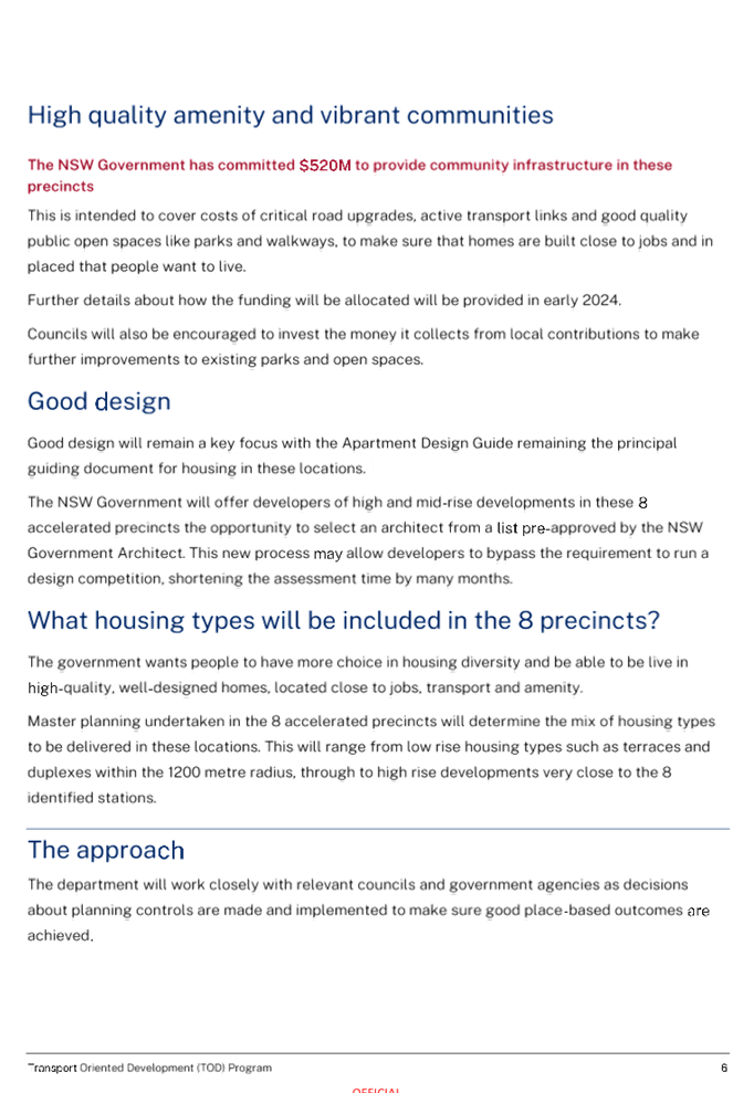 In December 2023, the NSW Government announced the Transport Oriented Development Program to facilitate additional housing with transport infrastructure. As part of this announcement, Lidcombe and Berala were identified in the Program, with a new State Environmental Planning Policy being prepared to allow for residential apartment buildings up to 6 levels to be built within 400m of these stations. It is noted that there are areas in Lidcombe and Berala under the Program that are currently not zoned for this level of development.