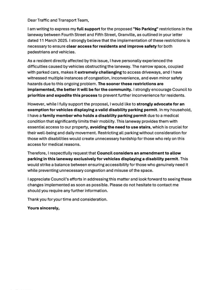 Cumberland Traffic Committee (CTC) at its meeting on 5 February 2025 considered a report (CTC-25-012) regarding the extension of the existing part-time 'No Parking' restrictions on the southern side of Mona Street, Granville, near Clyde Street, and the Traffic Committee recommended that: