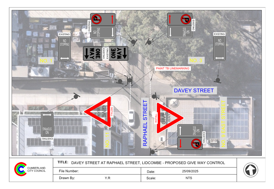 Plan – Davey Street and Raphael Street, Lidcombe – Proposed ‘Give Way’ signage and line marking