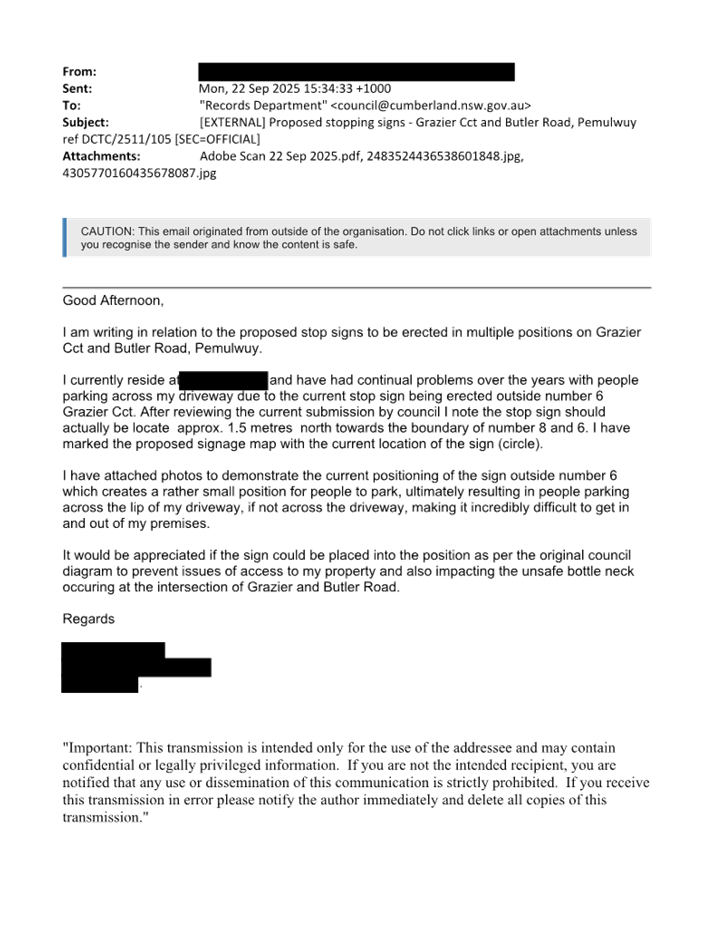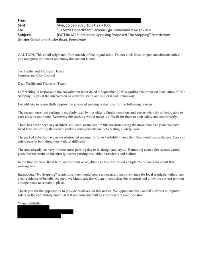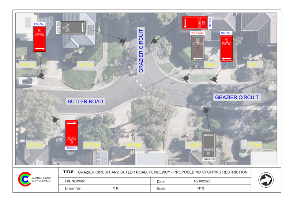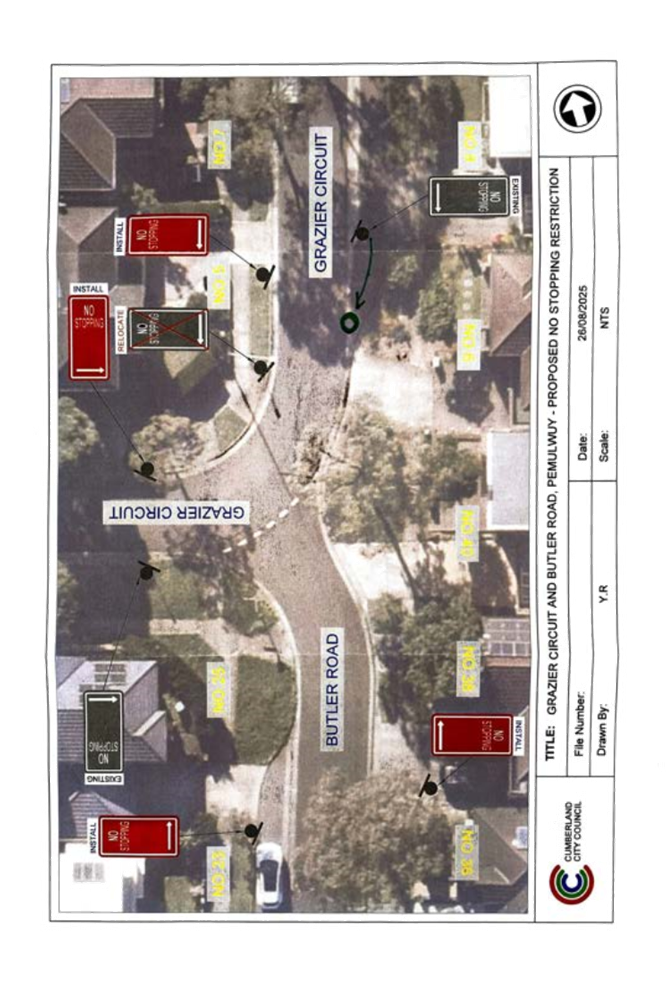 CLTF-25-214 GRAZIER CIRCUIT AND BUTLER ROAD, PEMULWUY – PROPOSED ‘NO STOPPING’ RESTRICTIONS