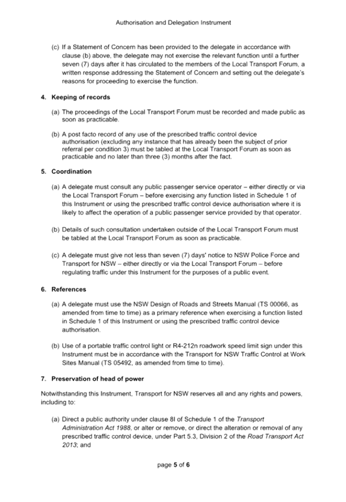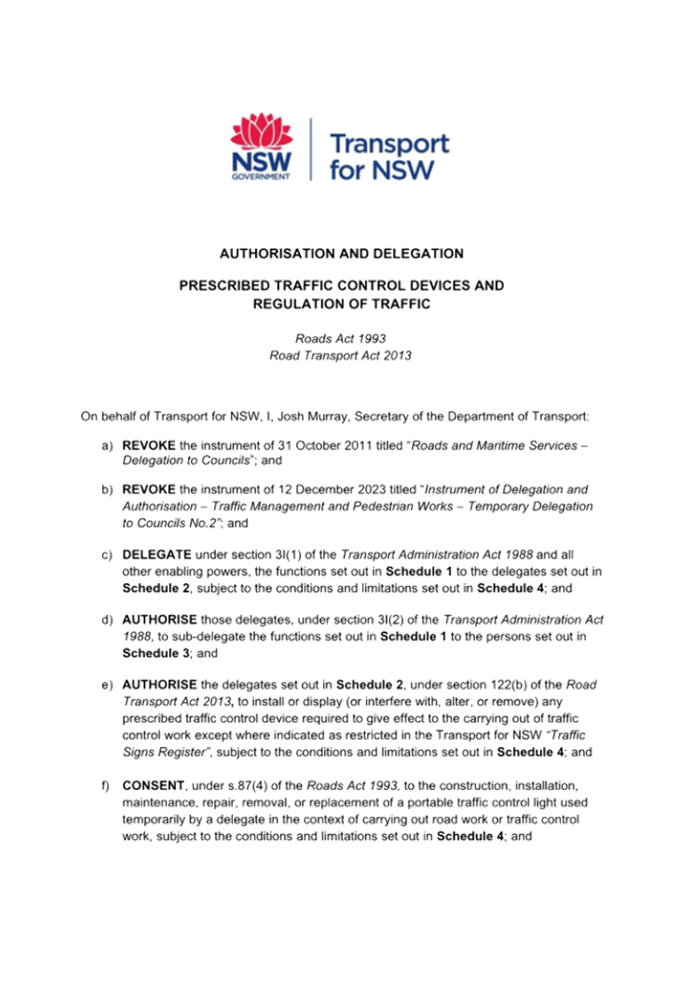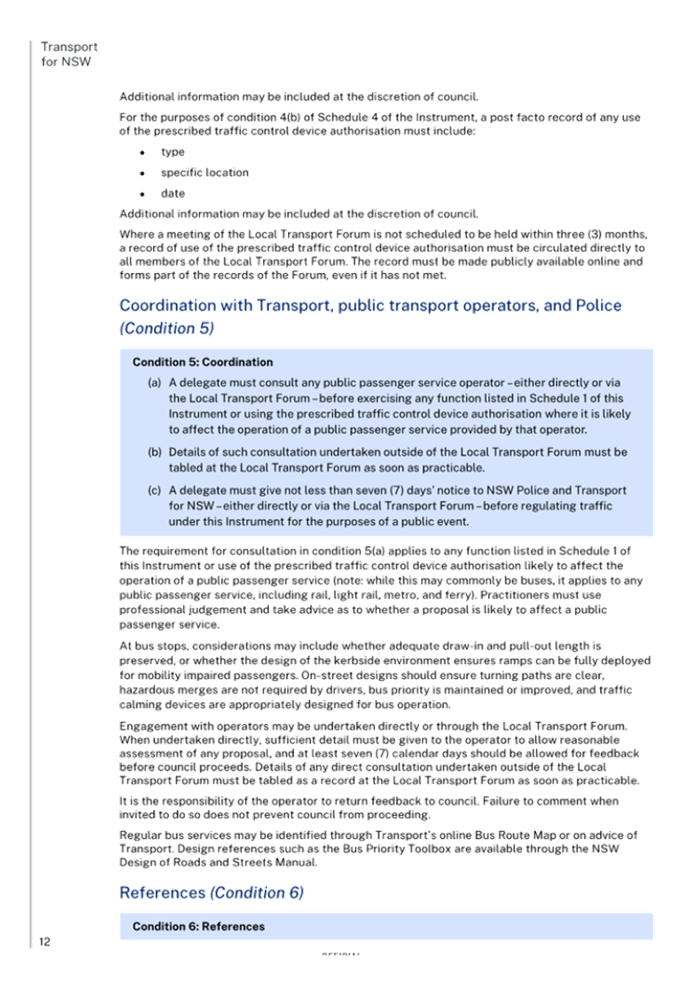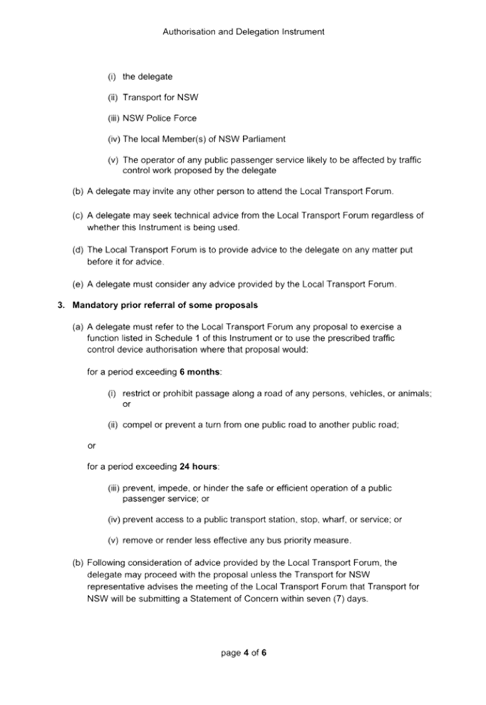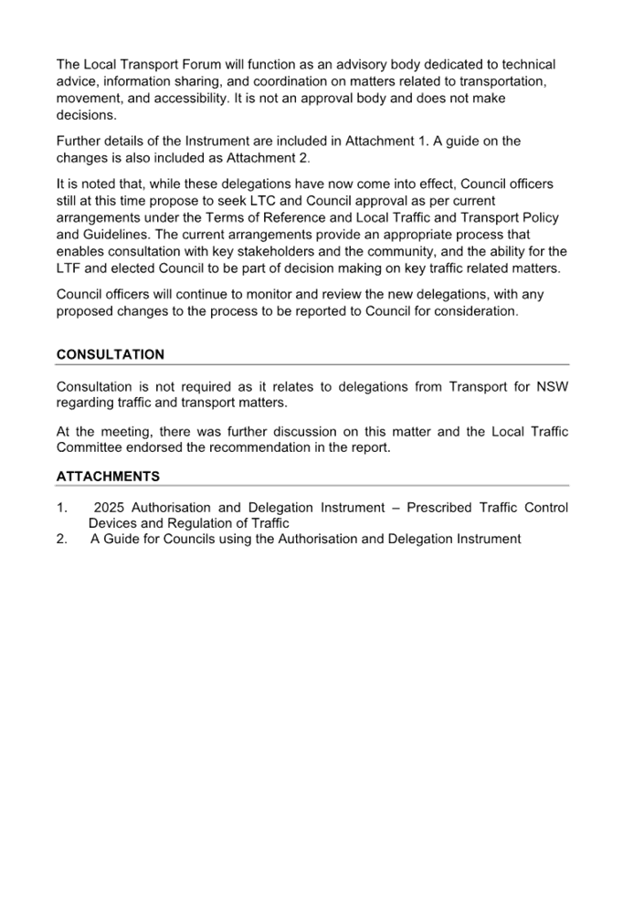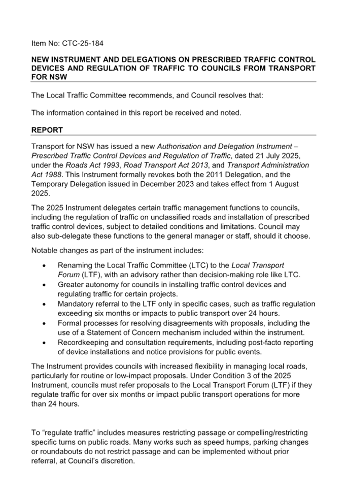 Previous Report – New Instrument and delegations on prescribed traffic control devices and regulation of traffic to councils from Transport for NSW